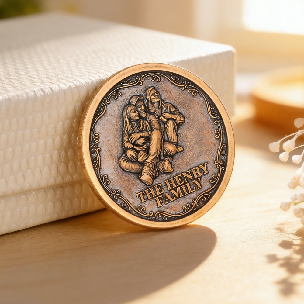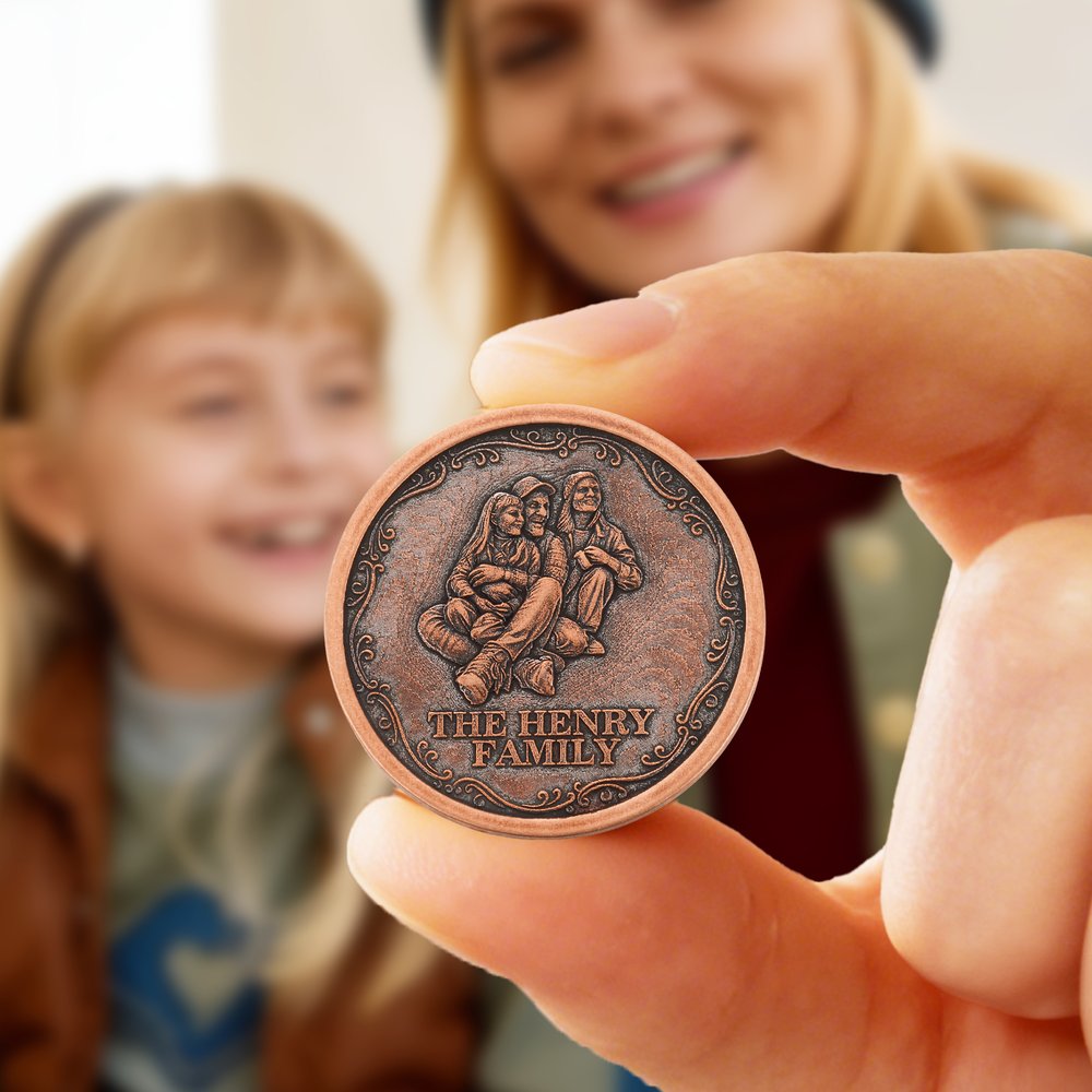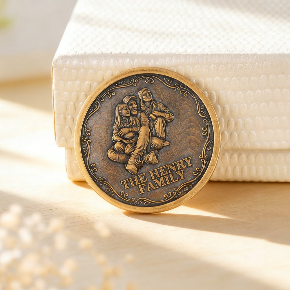 Compact yet substantial, this coin can be carried with you as a personal talisman or displayed as a cherished keepsake at home. Its vintage antiqued metallic finish, combined with the lifelike family portrait, adds a warm, sentimental touch to any space. It also offers a tangible way to feel close to loved ones, keeping family bonds gently preserved.