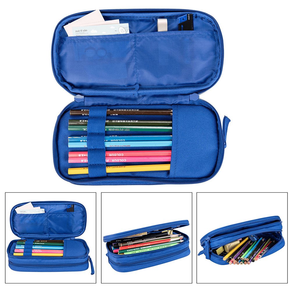 The pencil case boasts two large zipped pockets, three internal compartments, and five pen slots. It neatly organizes and stores various stationery items, fostering organizational skills in children.