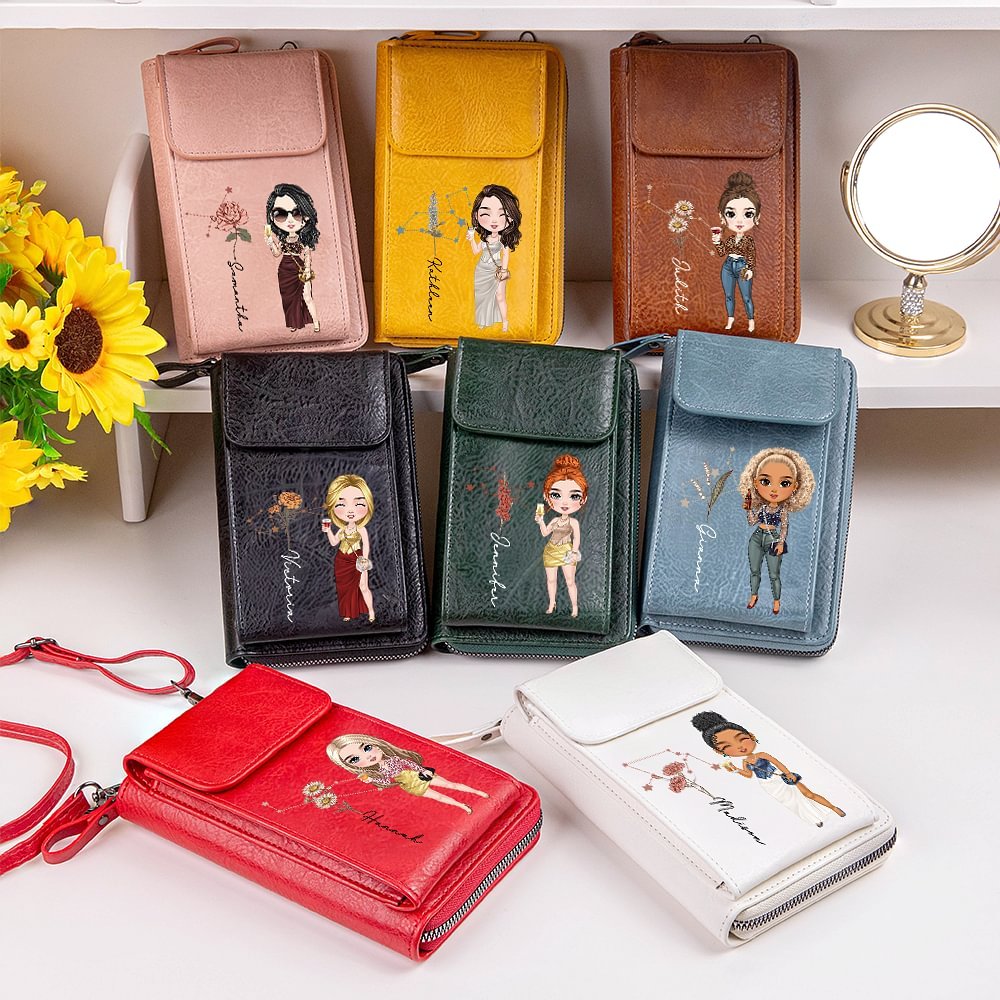Personalised Fashion Cartoon Character Birth Flower Leather Portable Crossbody Bag Wallet with Zodiac Sign and Name Birthday Gift for Women Girl