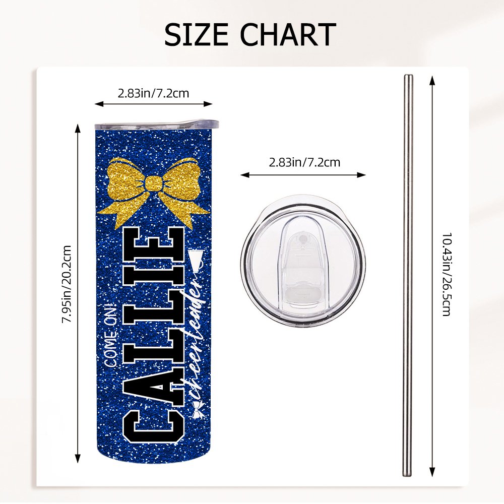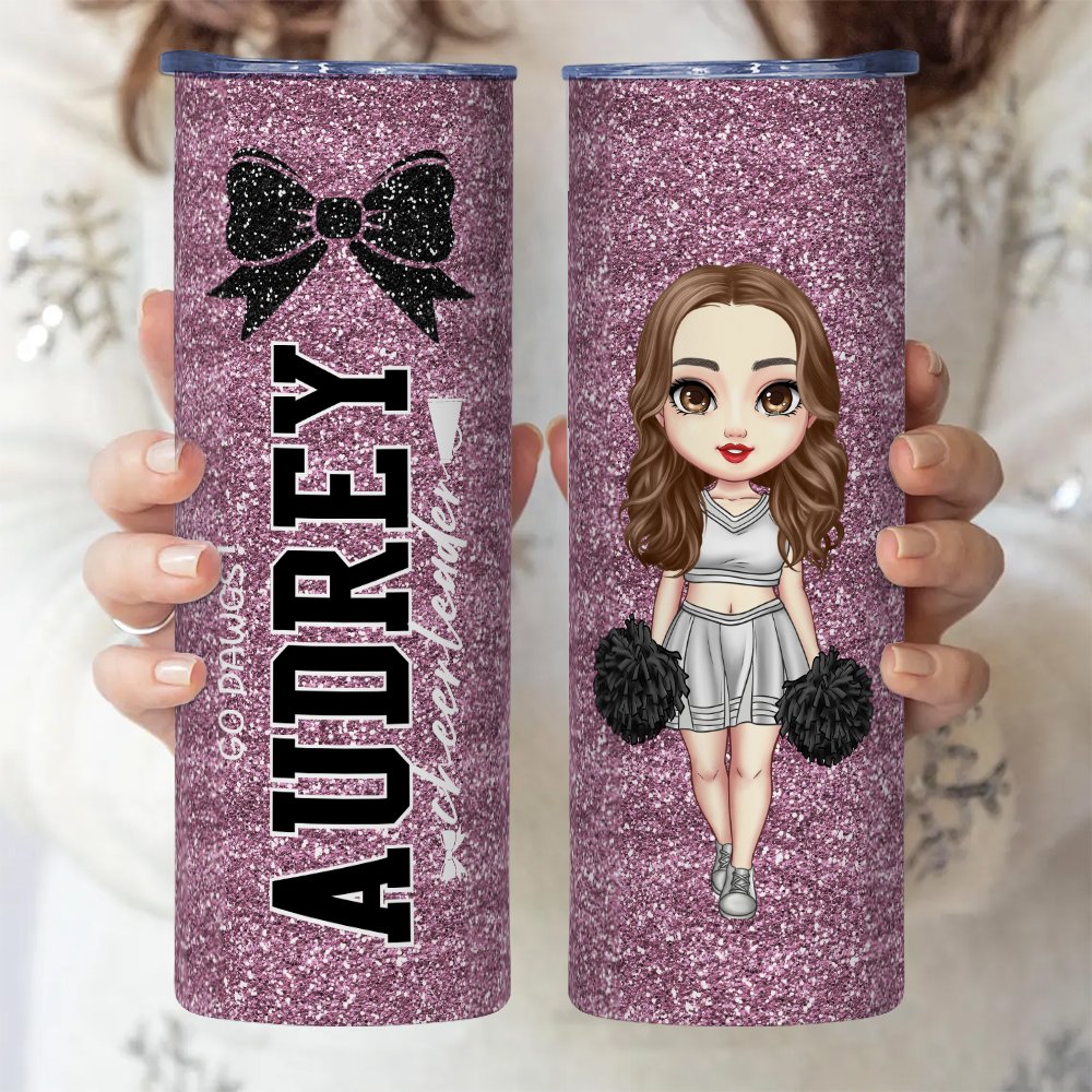 Personalised Faux Glitter Cartoon Cheerleading Girl Food-grade 20 oz Skinny Tumbler with Name Sports Team Birthday Gift for Cheerleader