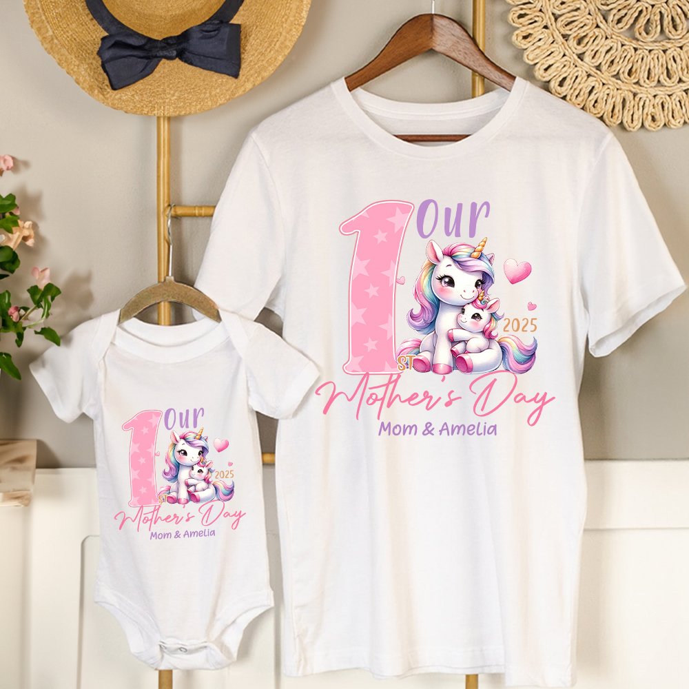This T-shirt and baby bodysuit are themed on a cute mom-child animal, the mother and baby are leaning on each other, showing a strong family atmosphere. The warm words "Our First Mother's Day" and the names of the children and mother are printed on the clothes, which adds a sense of exclusivity.