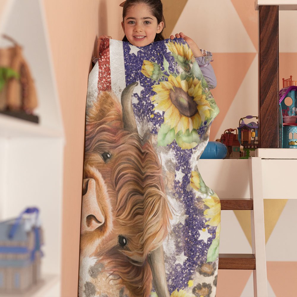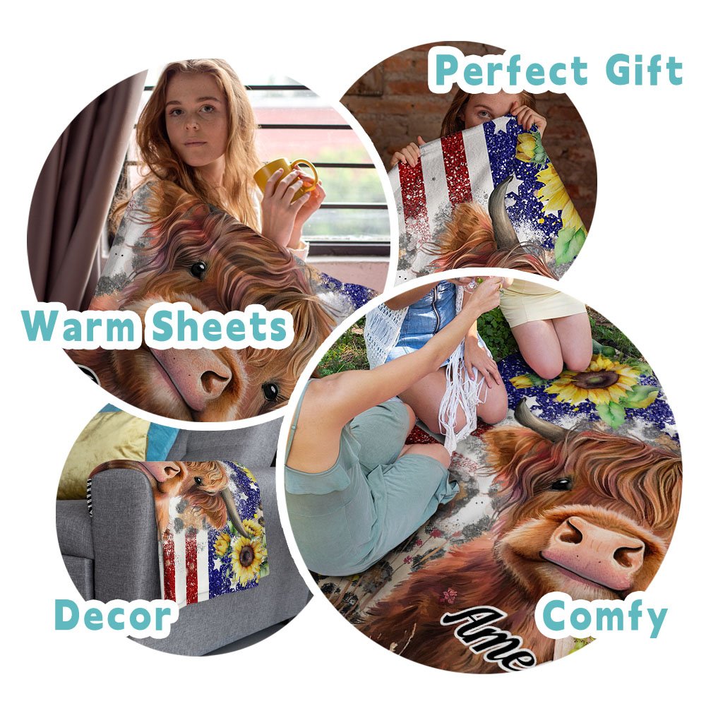 The blanket is printed with cute highland cows and American flags, as well as bright sunflower flowers, is the highland cow lovers can not miss a good thing. Five sizes can choose and three featured fonts Personalised with names, suitable for birthday gifts, Christmas gifts, and gifts for various important occasions.