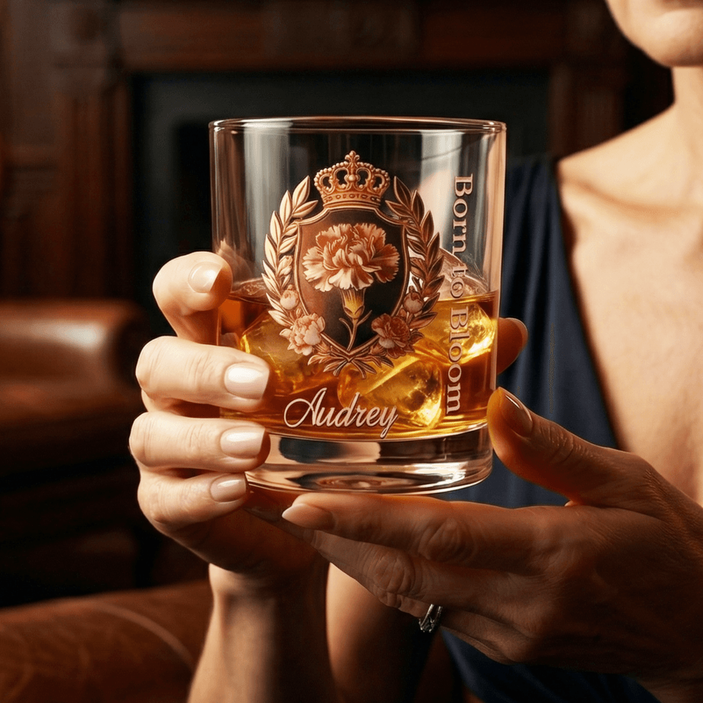 This whisky glass features an elegant crown emblem paired with soft carnation floral details. Customizable with a name and personal message—making your heartfelt feelings come to life. The refined design, from the printing pattern to the Personalised text, adds a sense of ceremony and exclusivity.