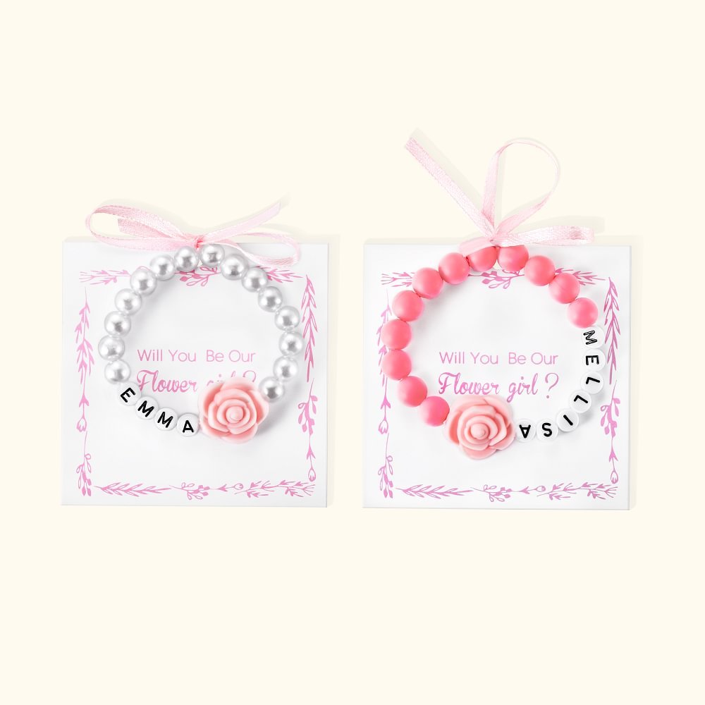 Gift for flower girl with flower charm and name. Composed of beads and flower that all little girls love. Flowergirl gifts bracelet with a special design card written: "Will You Be Our Flower girl?"