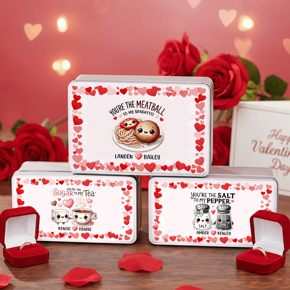 Inspired by the idea of a "perfect pair" in food, this biscuit tin features classic combinations like butter and bread, coffee and donuts, and more. It can be customized with both partners' names, and the delicate pattern on the metal lid serves not only as a visual decoration but also as a sweet declaration of your relationship.