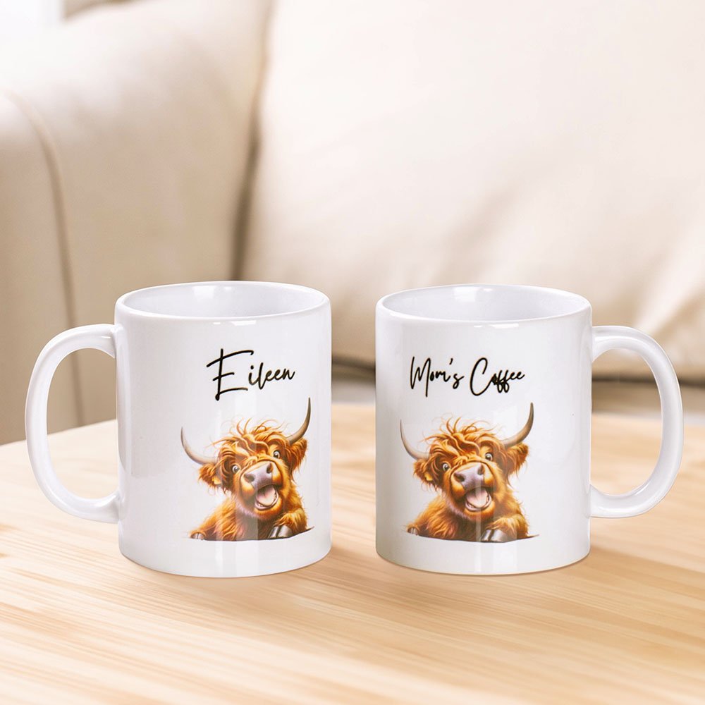 Our funny cow mug features a delightful, whimsical highland cow design. It can be Personalised with the recipient’s name, making it a cute and unique accessory for cow lovers.