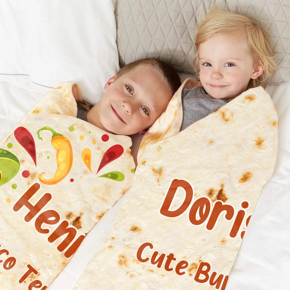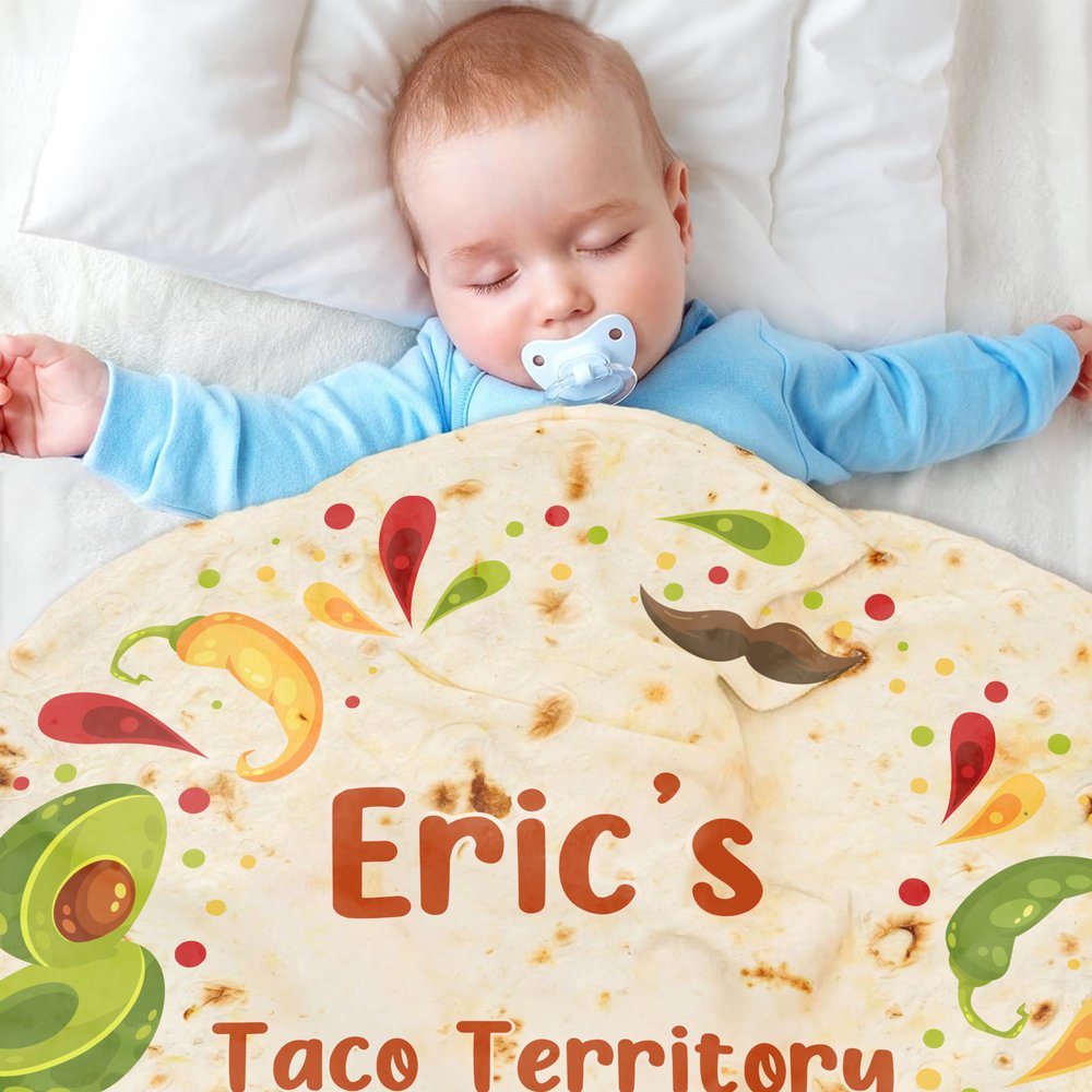The round blanket as a whole takes on the appearance of a taco, with natural toasting mark details and soft yet vivid colors. The customized name and text are printed on the blanket in lively fonts, and around them are patterns of ingredients like chili peppers, avocados, and tomatoes, which echo the "gourmet-like" design of the taco.