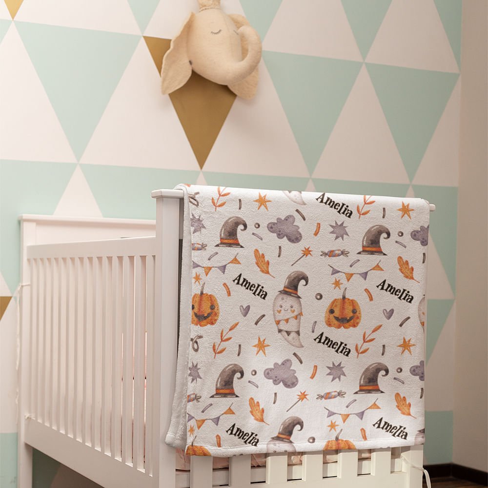 This customizable Halloween blanket uses festive design elements such as ghosts, bats, and wizard hats to create a mysterious and fun Halloween atmosphere. The pattern on the blanket is bright in color and clever in design, which can not only attract the eye but also add a warm and fun holiday to the home.