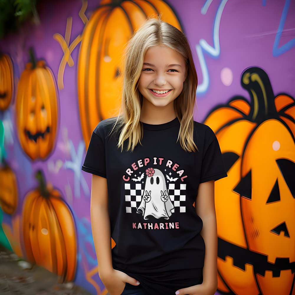Our t-shirts feature classic Halloween elements such as black and white patterns, ghosts, pumpkins, and skeletons. These iconic designs add a spooky touch to your child's wardrobe while embracing the festive spirit. Additionally, the option to Personalise the shirt with short text allows children to express their individual tastes and interests, making it a unique and thoughtful gift.