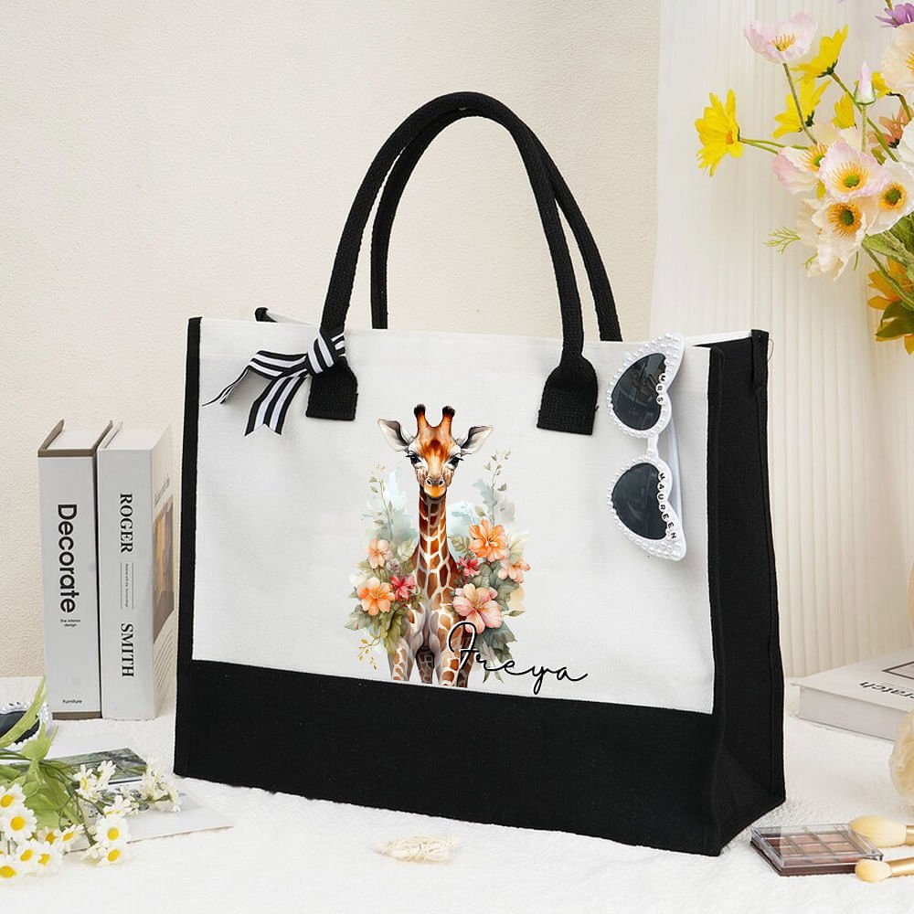 This tote bag uses a classic black and white tone, combined with flowers and giraffe patterns, showing a perfect combination of nature and fashion. On the black and white background color, the delicate flower pattern and giraffe image complement each other, coupled with the embellishment of ribbon, both elegant and interesting. 20 different giraffe forms make your choice even richer. You can also customize the name on the bag to make it even more special.