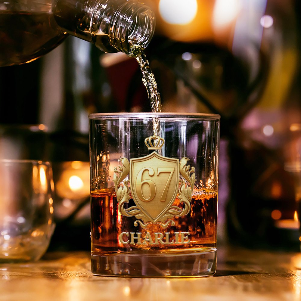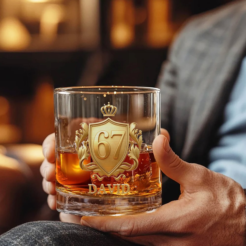 Showcasing a gold badge with the number “67” and a regal crown, this whisky glass can be Personalised with your chosen name, making it a unique blend of classic style and modern, funny design that captures the fun spirit. The clear, premium glass highlights the rich color of your favorite spirit, while the vintage-inspired crest adds a touch of sophistication—perfect for collectors and connoisseurs who appreciate individuality.