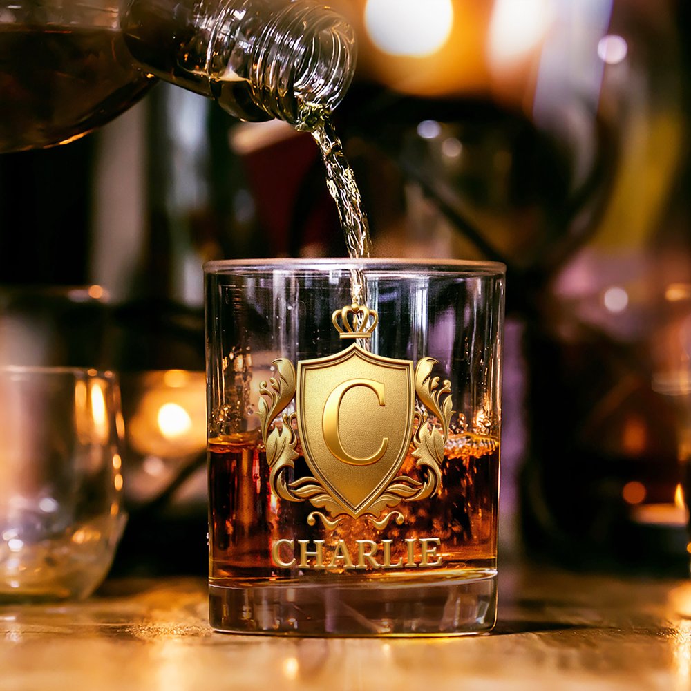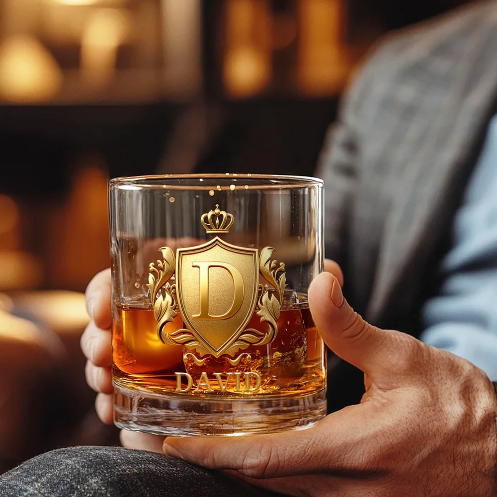 The glass features a striking gold 3D badge design, customizable with initials and names. Clear and durable, it perfectly blends vintage elegance with personalization, enhancing your whisky tasting experience and becoming a cherished collectible for whisky enthusiasts. More than just a glass, it reflects your personality and appreciation for fine spirits.