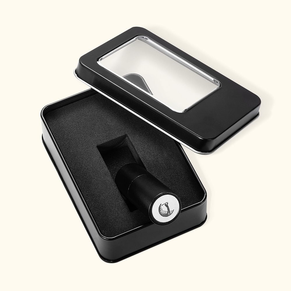 The golf stamp comes in a high-quality metal box, ready for giving. The clear window lid on the box allows for easy viewing. This packaging not only protects the stamp but also enhances the overall presentation.