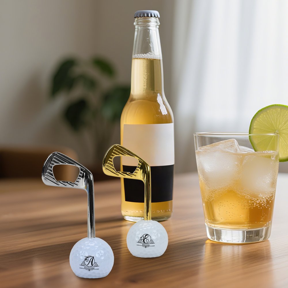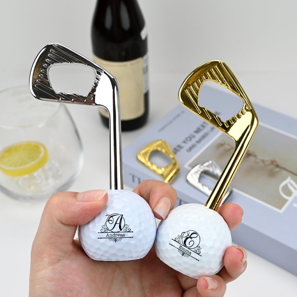 Featuring a realistic golf ball and club design, this bottle opener cleverly incorporates golf elements for a unique and eye-catching design. Available in two classic silver and gold colors, it exudes a refined feel. The ball can be customized with a name for an even more exclusive touch.