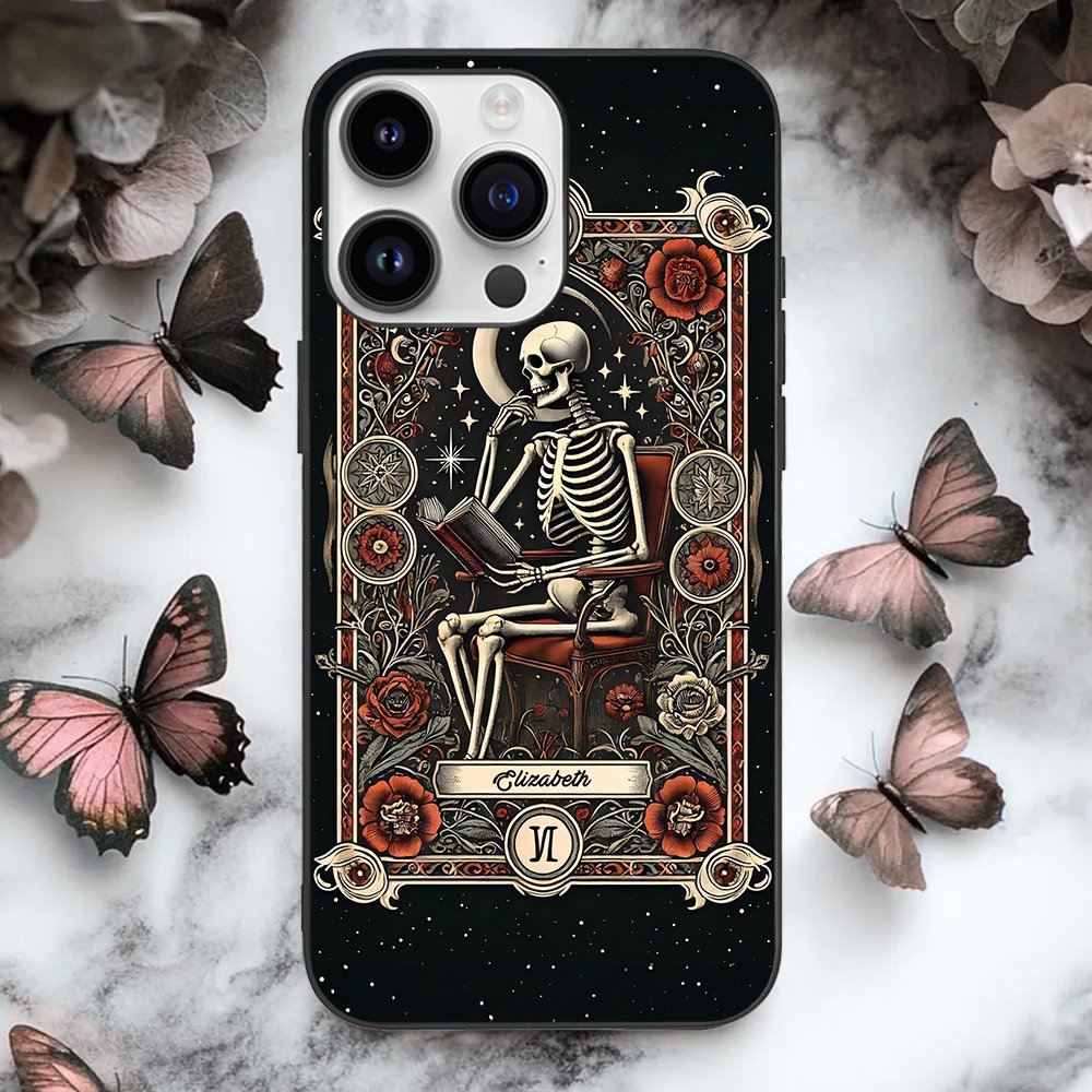 This phone case beautifully combines gothic skeleton imagery with books and floral elements, making it a perfect accessory for gothic lovers and readers. You can Personalise it with a name, making it a unique expression of individual style and cultural affinity.