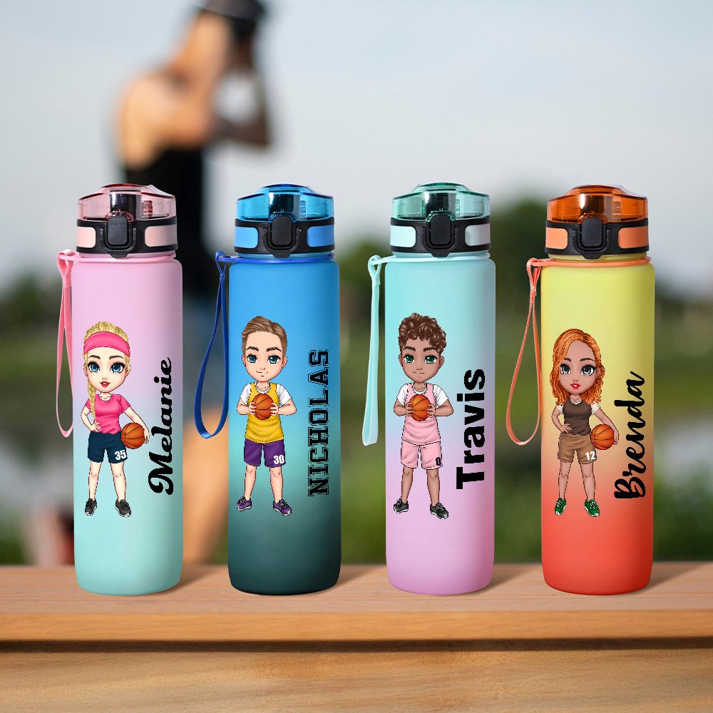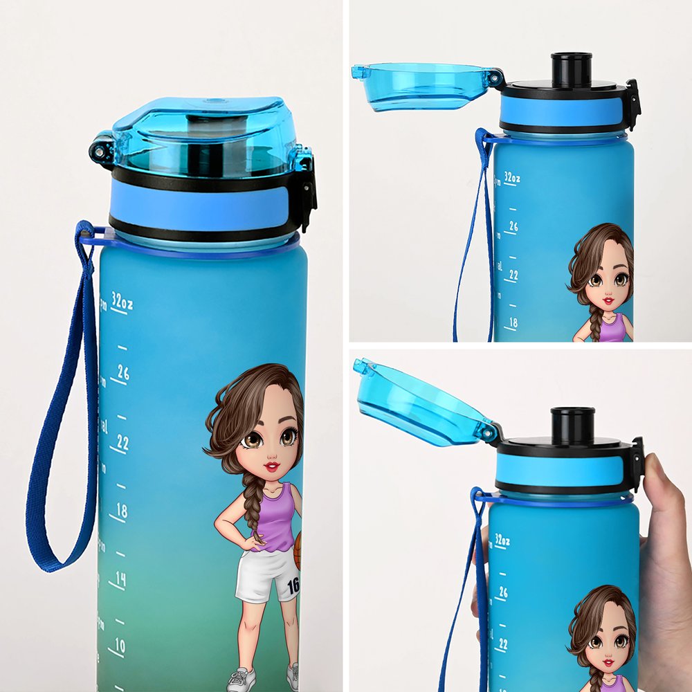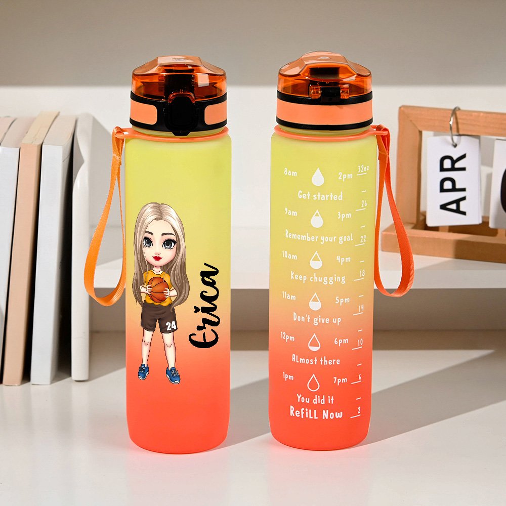 The gradient color scheme is a visual treat, giving it a trendy and modern look. The cartoon basketball-themed illustrations are full of charm and energy, depicting lively basketball boys and girls in action. You can have your name or the name of a special someone printed on it, making it a one-of-a-kind keepsake. Each time marker on the bottle indicates the amount of water you should drink at a specific time, acting as a gentle and consistent reminder to stay hydrated throughout the day.