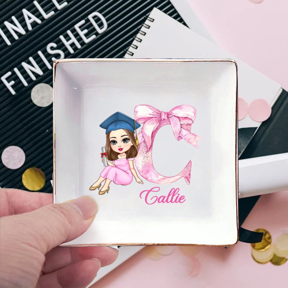 This jewellery dish can be Personalised with cartoon graduation characters and combines elements of pink bows and initials, which are elegant and sweet, perfectly showing the style and achievements of the graduating girl. You can customize the graduate's name to create a unique and meaningful souvenir to congratulate them.