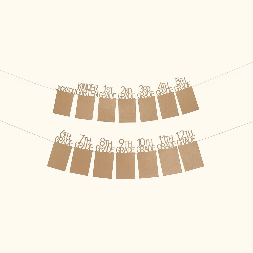 The grade milestone photo banner will add a personal, unique, and fun element to your gorgeous grad party! Note: Banner details - Holds 13 vertical photos for kindergarten to grades 12, simply use glue or double-sided tape to adhere the photos on. Comes with 5 meters of hemp rope. The customized version contains a total of 14 kraft papers, only one of which can be additionally customized, and the remaining 13 are the same as the regular version. These banners are suitable for photos of size 4''*4''/5''*5''/4''*6''/5''*7''.