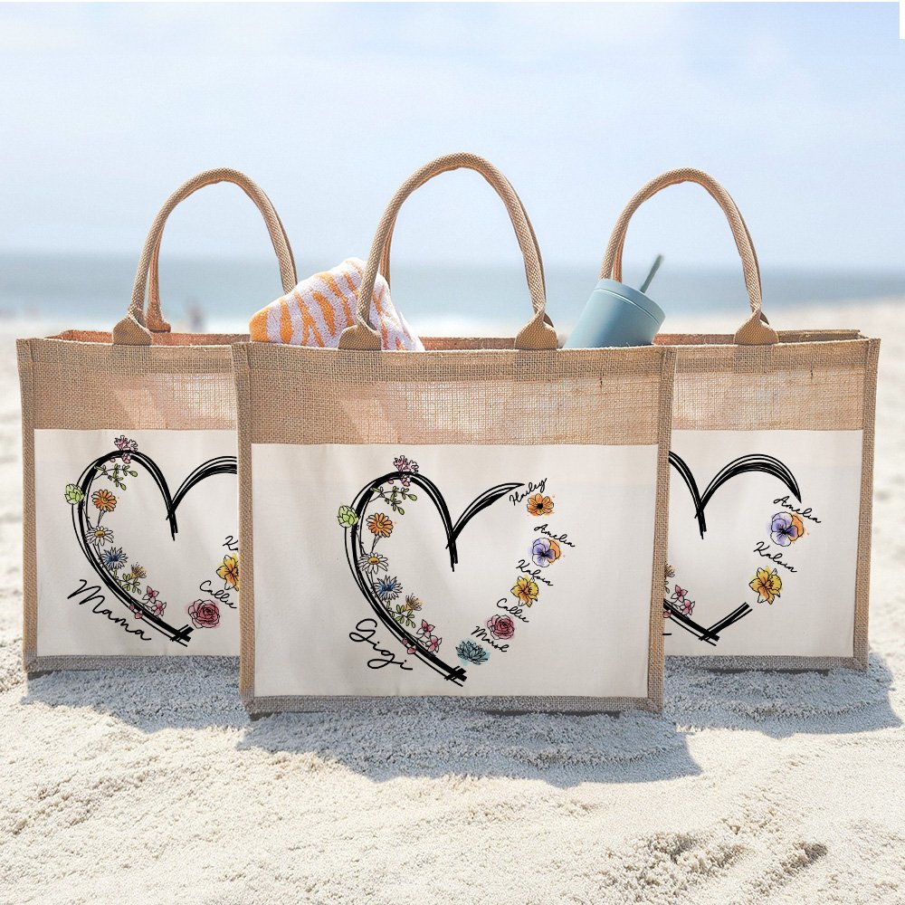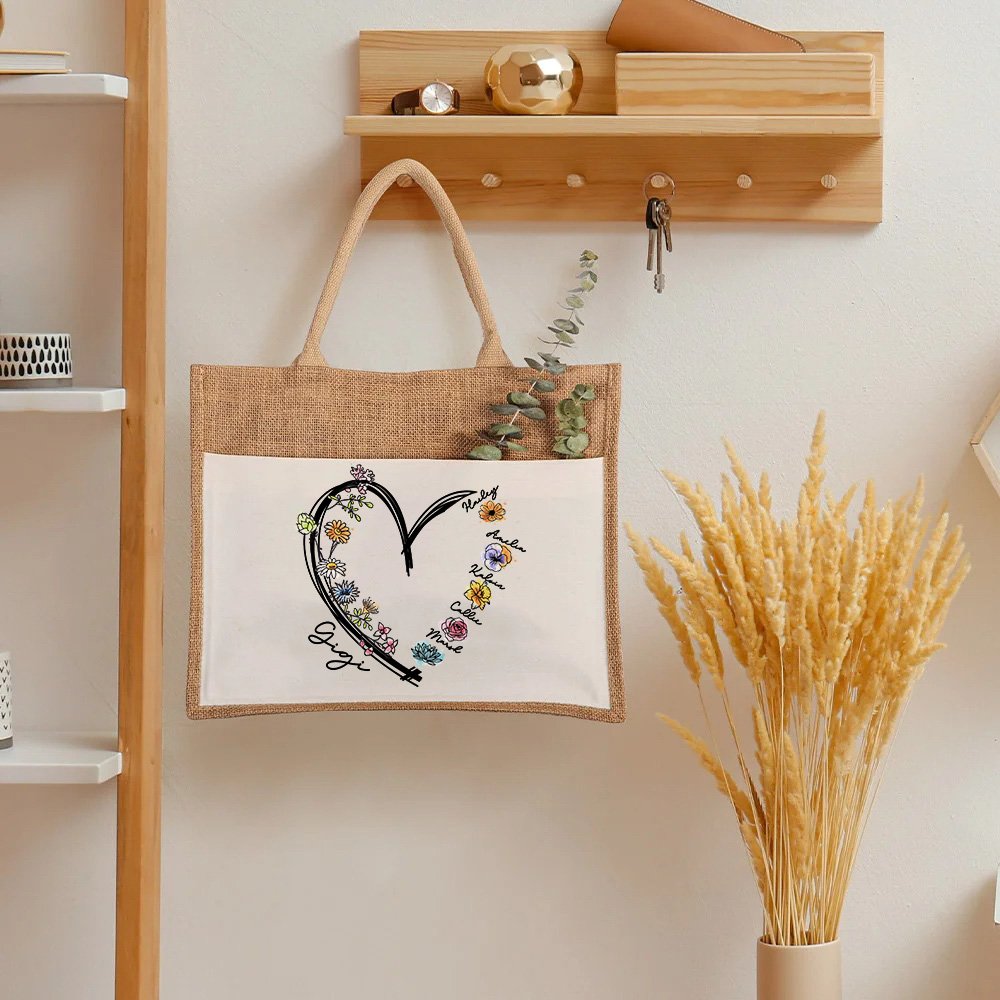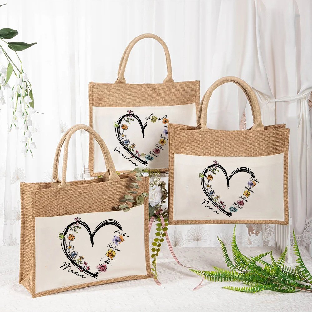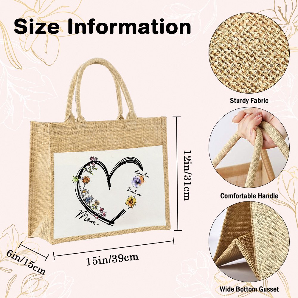 Featuring a heart-shaped design that can be Personalised with birth flowers and names, this tote bag showcases a unique and sentimental aspect of your everyday style. The customizable floral design symbolizes the love and connection between family members, making it not only practical but also deeply meaningful.