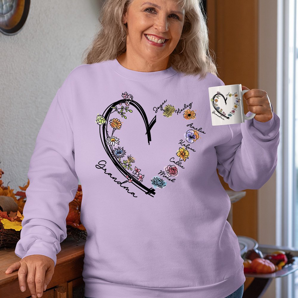 This sweatshirt stands out for its sophisticated design and elegant look. The heart is cleverly placed in the centre of the sweatshirt, which is not only a romantic interpretation of love and gratitude but also gives this sweatshirt a unique emotional value. It also cleverly incorporates elements of the birth flower into the design of the sweatshirt, which you can choose according to the month of birth. You can also customize the name on the sweatshirt to make it more personal.