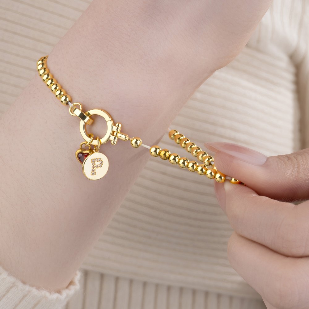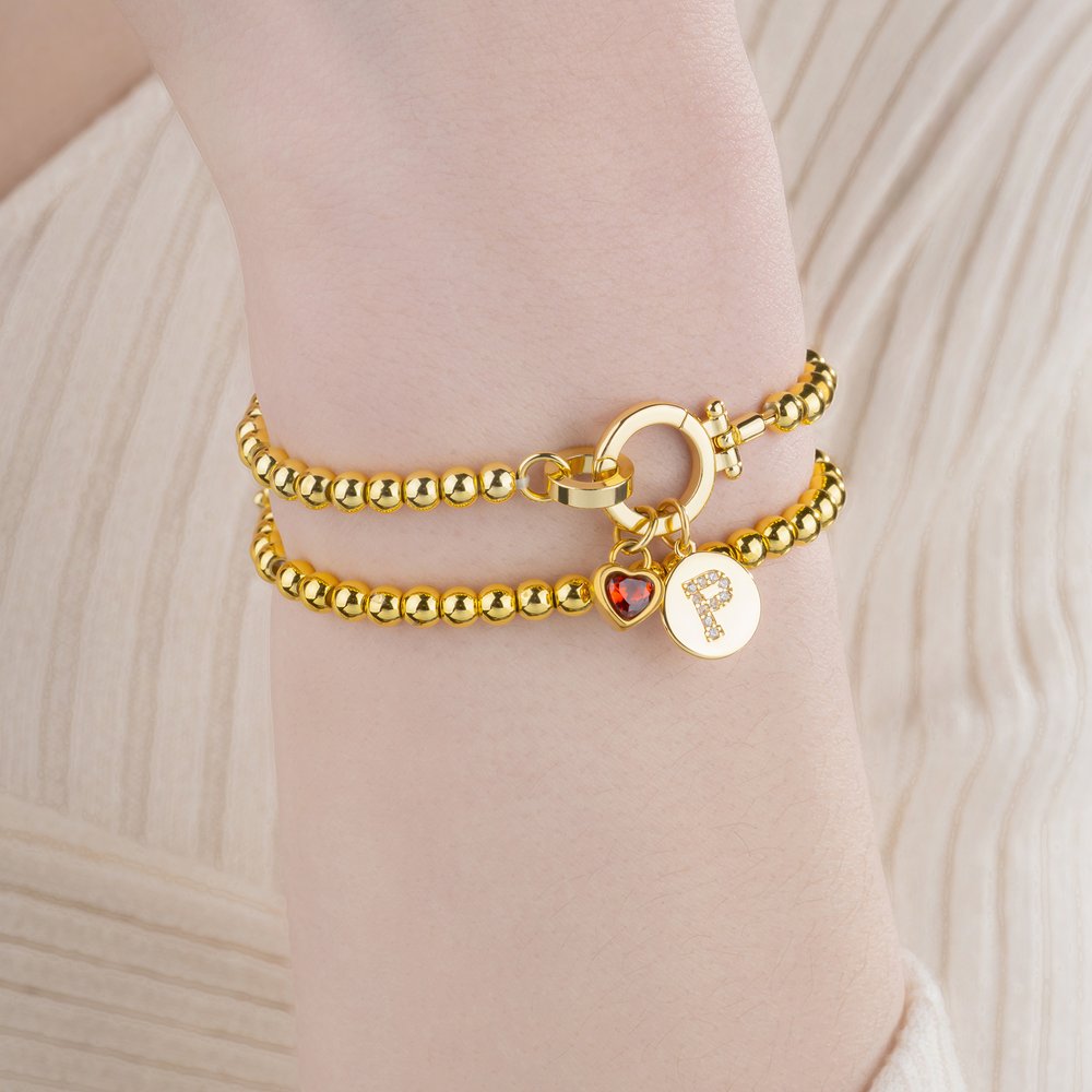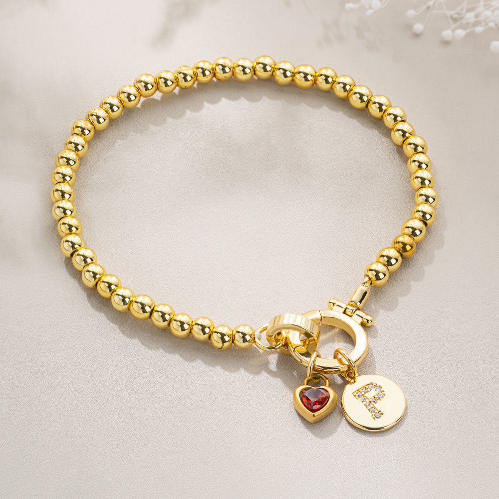 This beaded bracelet features smooth, rounded golden beads and two delicate charms: one set with a heart-shaped birthstone and the other with a round charm featuring an initial. Customization of the birthstone and initial is available, showcasing understated elegance and incorporating themes of faith, hope, and love into the details. It retains the timeless elegance of a classic beaded bracelet while also expressing individuality.