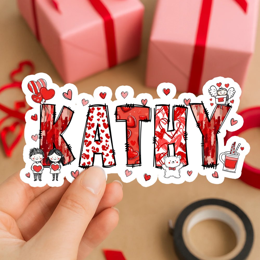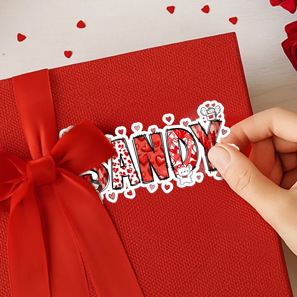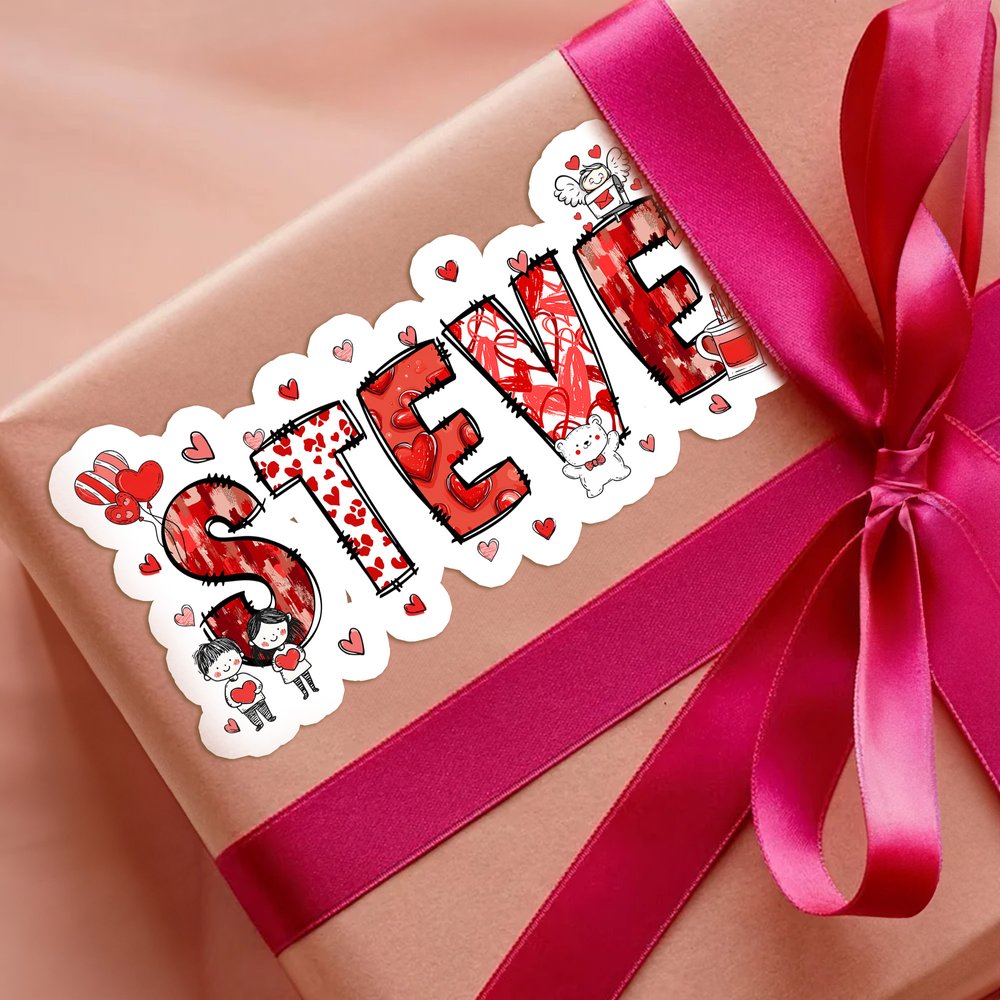 Visually, the sticker has a vibrant, whimsical style. Its bold, uppercase name features red and pink heart patterns, surrounded by playful Valentine’s elements like cartoon couples, teddy bears, and tiny hearts. The hand-drawn aesthetic and bright color palette blend romantic charm with playful energy, creating a sticker that’s both eye-catching and full of festive love.