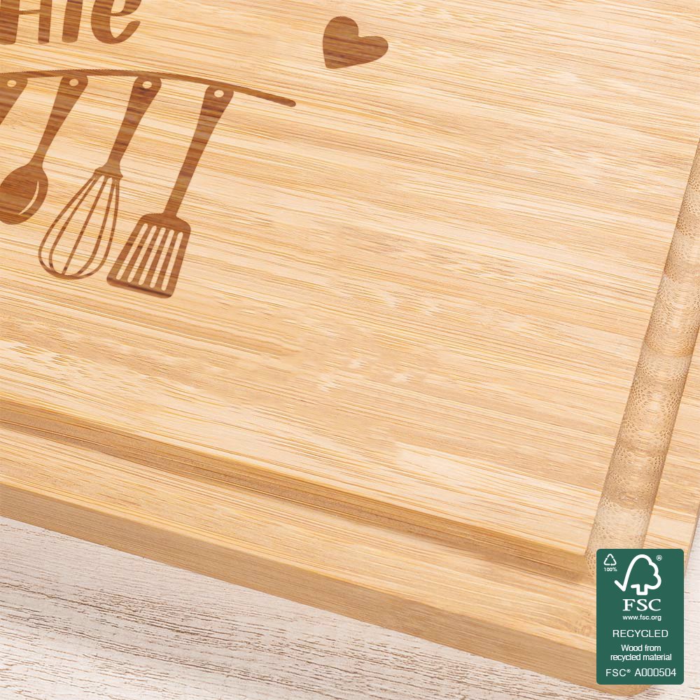 Our cutting board features simple lines and patterns of flowers, chef hats, hearts, and various kitchen utensils. You can add your name and caption "The Kitchen of ... made with love" to create a unique kitchen accessory.
