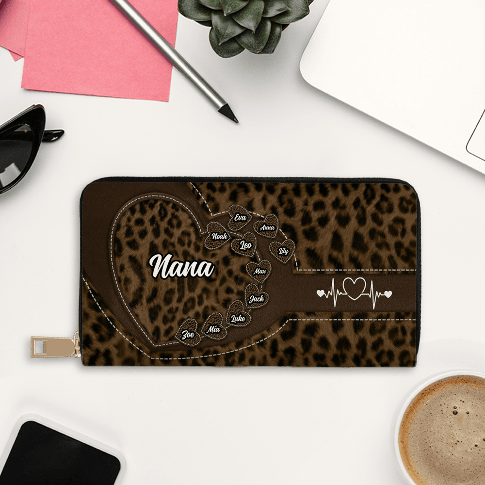 Classic leopard texture meets dark brown stitching to create a unique look that balances fashion-forward edge with vintage elegance. The heart-shaped area can be customized with grandchildren's names, adorned with heartbeat line details—as if imprinting the love of family bonds right into the palm of her hand. Every element strikes the perfect harmony between wild sophistication and heartfelt tenderness.
