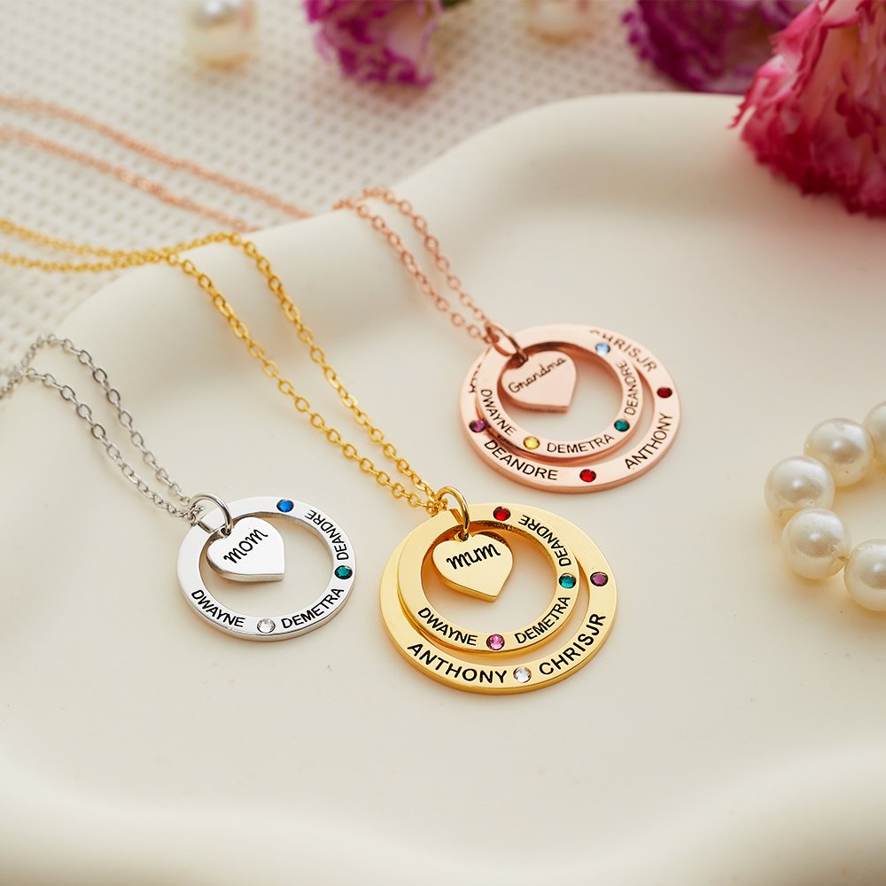This Personalised heart birthstone necklace with circles cleverly combines names with birthstones that represent family members. Circles can be customized with 1-7 names and birthstones. Pendants with four names and above are designed in concentric circles. The mother's name is in the center of the heart, surrounded by family names and birthstones, symbolizing the centrality of a mother's love and the strong bond between mother and family.
