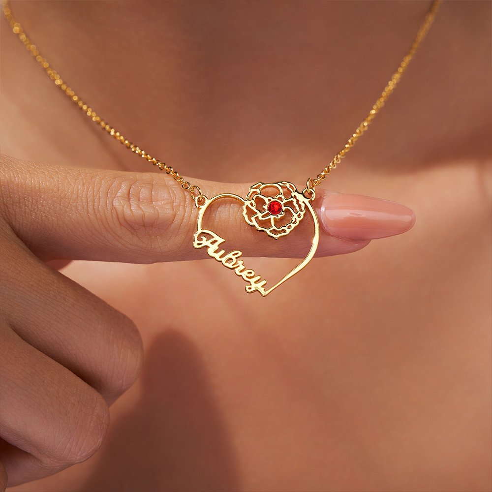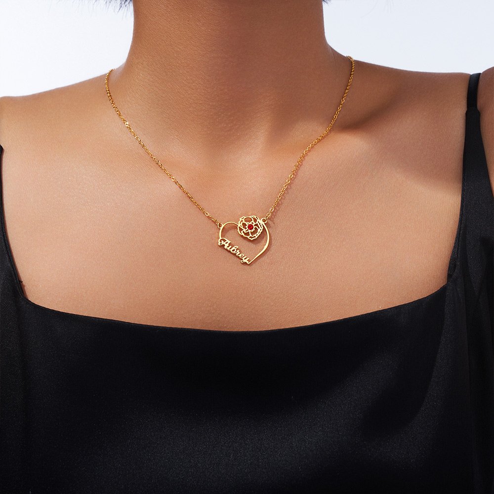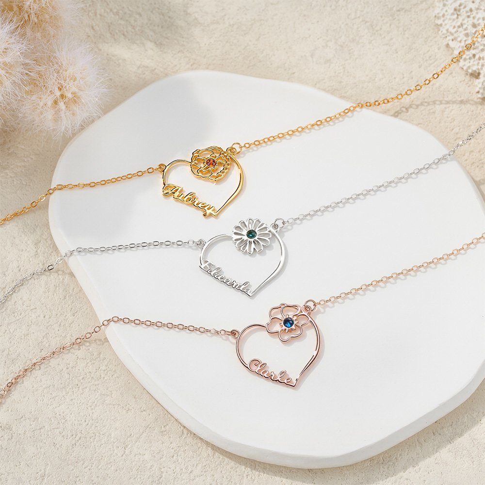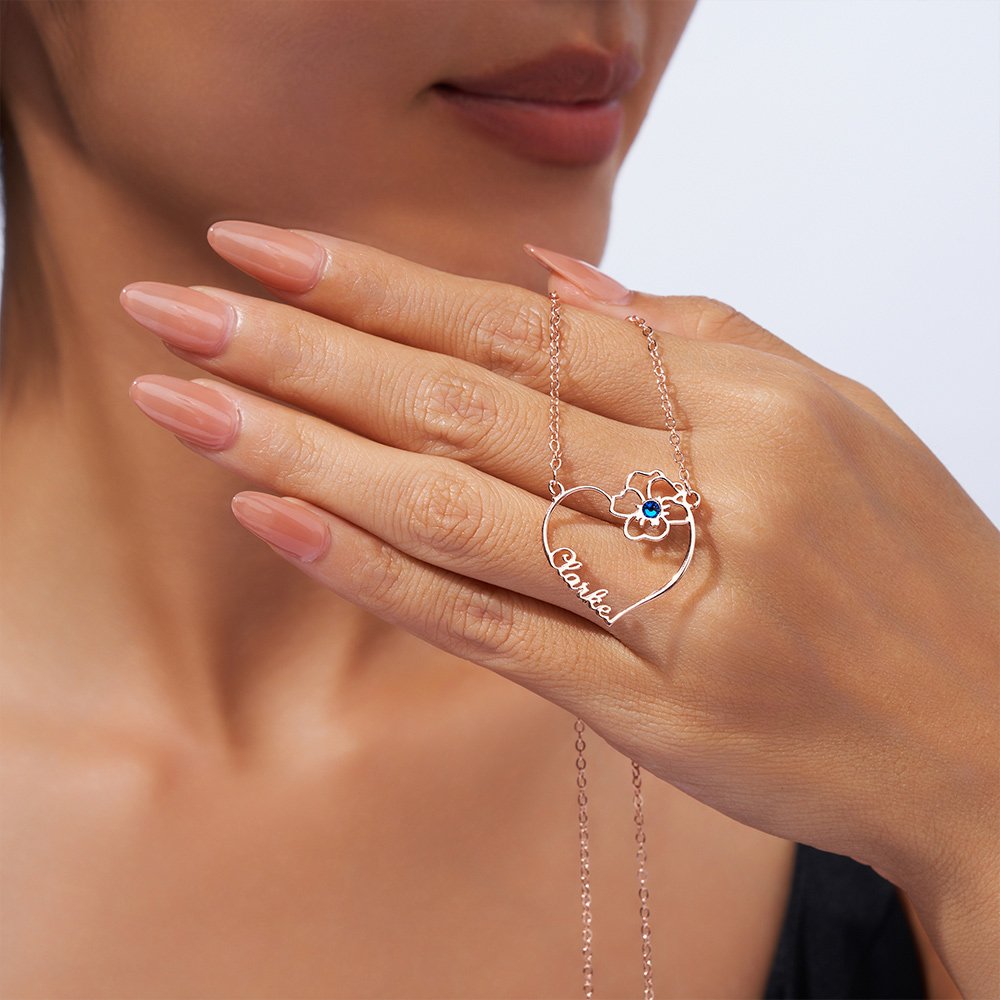 Our necklace pendant features a heart-shaped silhouette and incorporates Personalised names, birth flowers, and birthstones, symbolizing everlasting love. You can choose the birth flower and birthstone that correspond to your or your partner's birthday, give the necklace exclusive symbolic meaning, and customize the name to create a unique and elegant piece of jewellery.