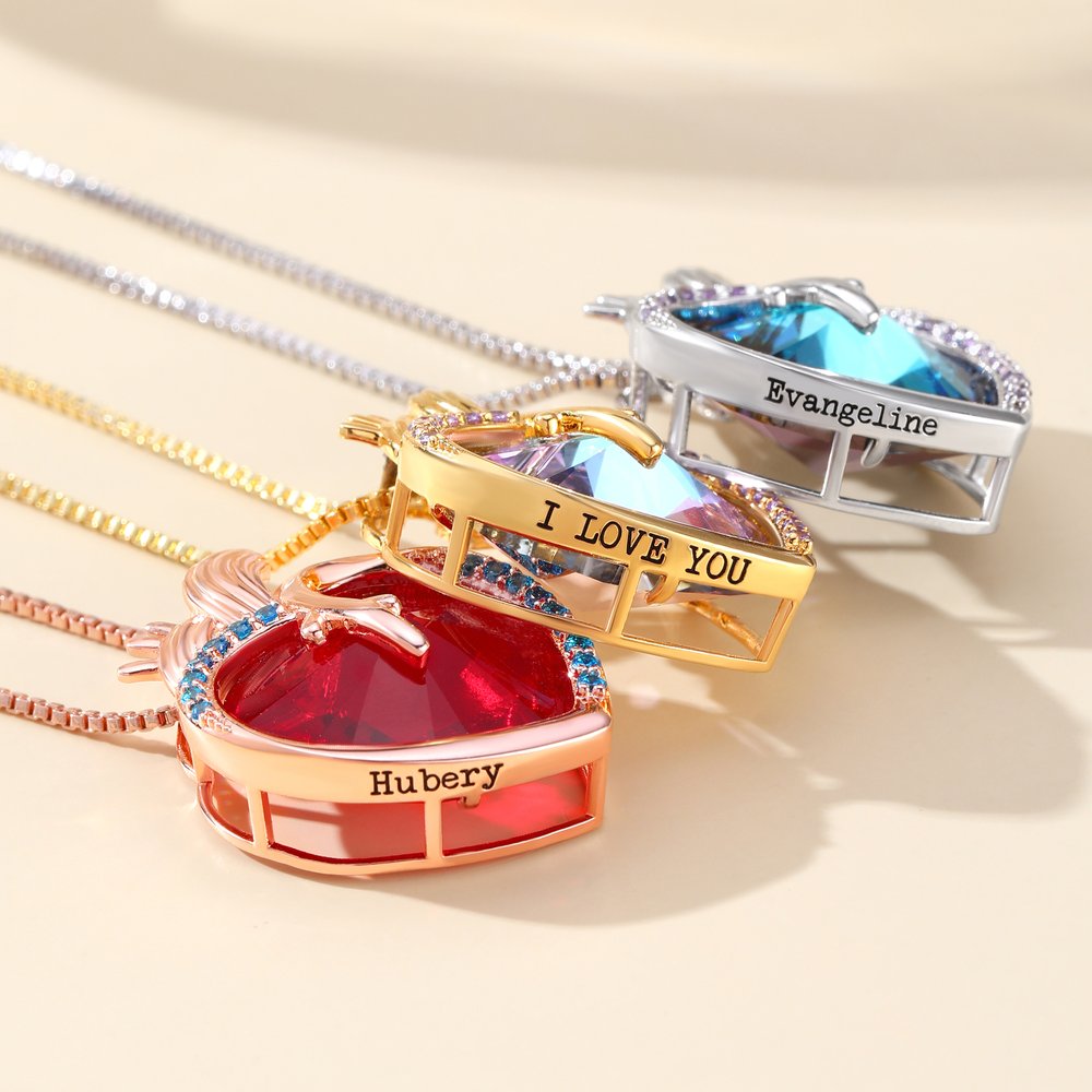 The heart-shaped outline on the edge perfectly embodies sincere affection and protection. The edge can be customized with your birthstone, cleverly imbuing the necklace with unique meaning, each bearing a unique blessing. The center stone of the necklace is available in three colors to suit every taste and individual expression. Customized text can also be added to the side for added significance.