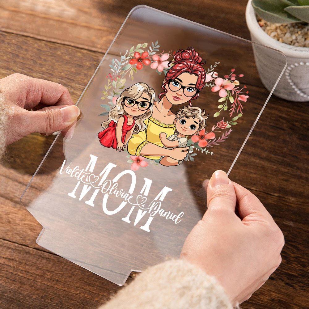Our night light features a design with cartoon illustrations of a mother and 1-2 child, allowing you to freely customize their styling and outfits. Additionally, we offer a custom name service. The names you provide for the mother and child will be connected by a heart symbol, complemented by a heart-shaped flower crown behind the characters. This design fully expresses the deep bond between a mother and her child.