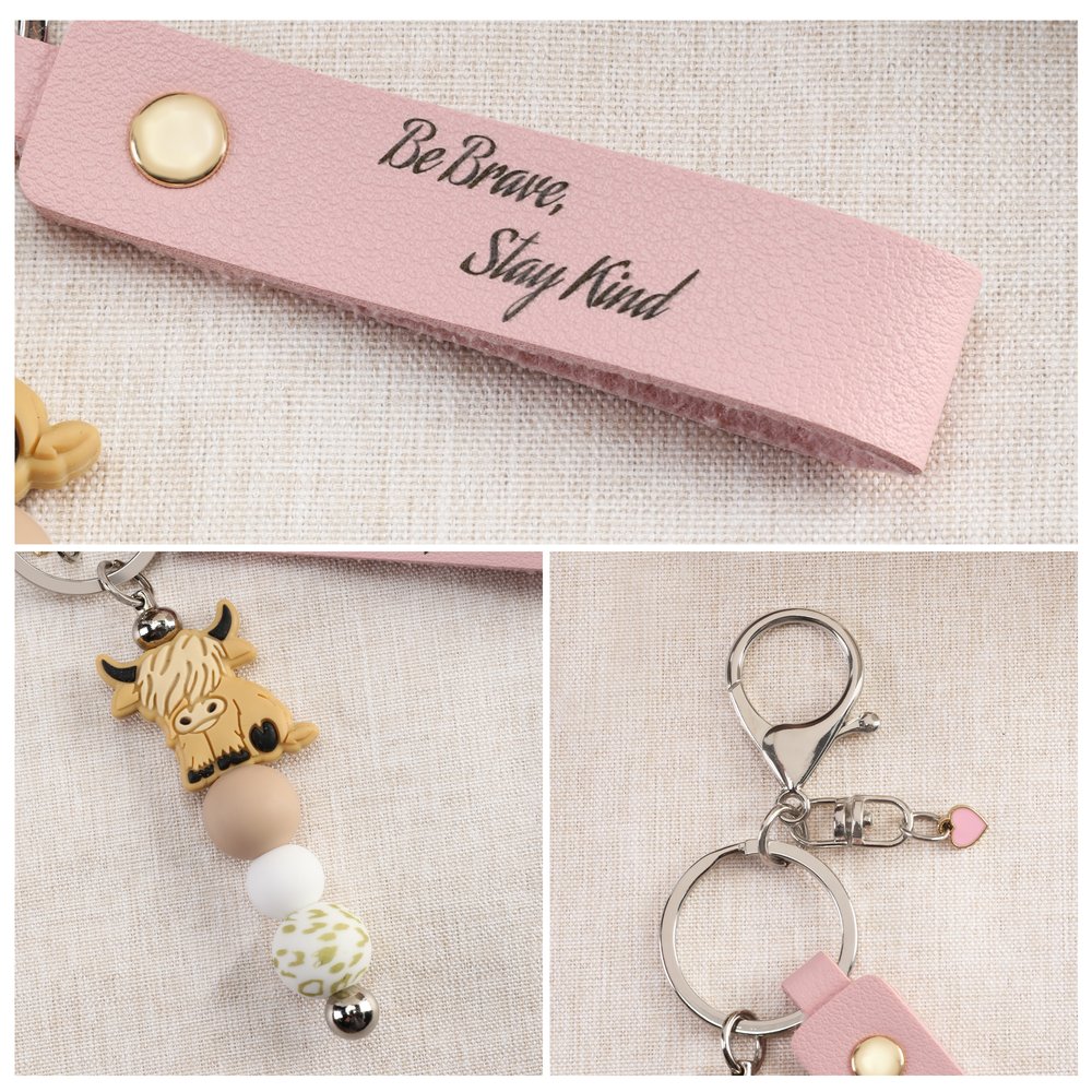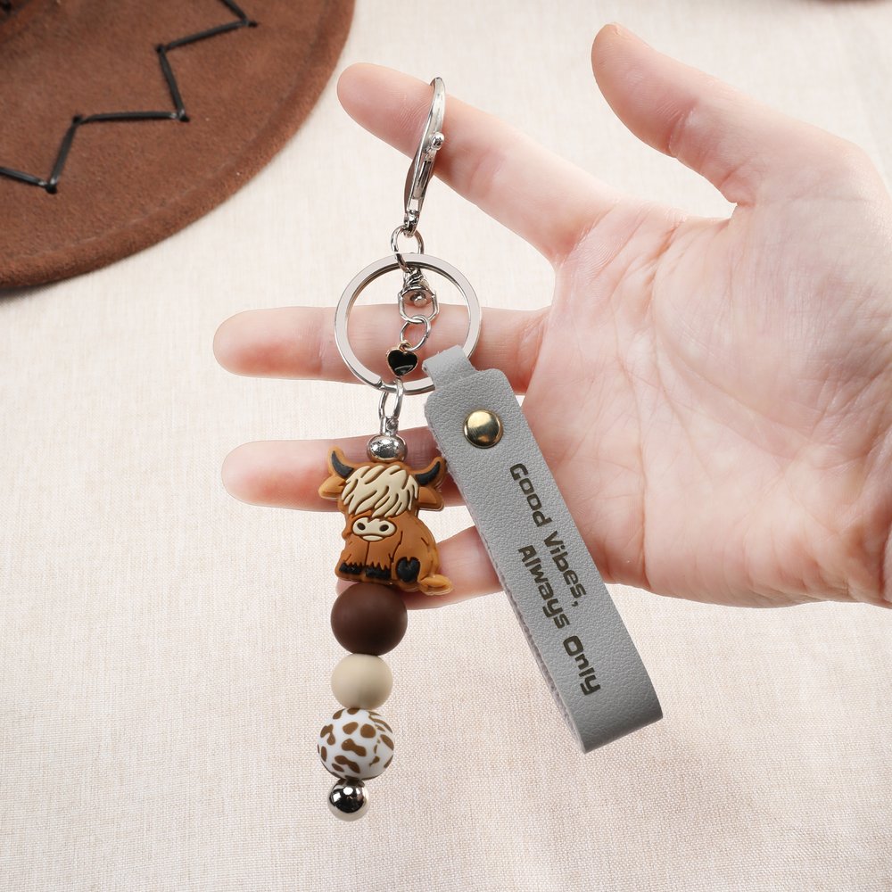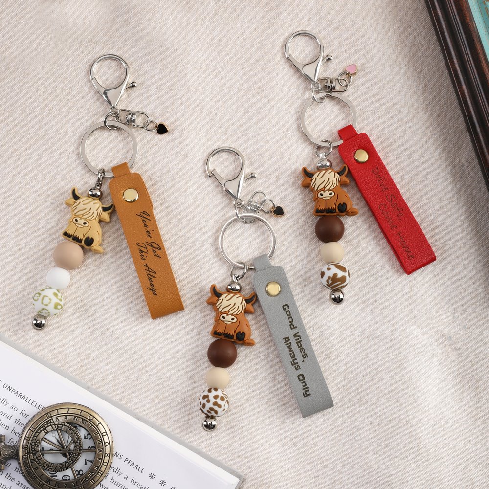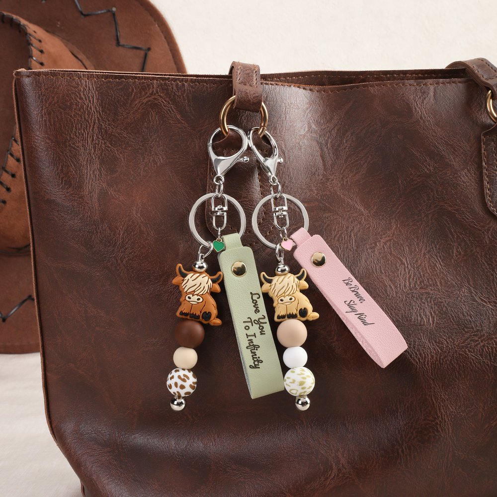 Crafted from multiple high-quality materials, ensuring both aesthetics and durability. The Highland cow, beads, and heart charms are resistant to deformation and fading; the PU leather strap has a smooth, warm texture, and the customized name and text remain clear even after prolonged friction in bags or pockets. The clasp is secure, effectively preventing keys from falling out.