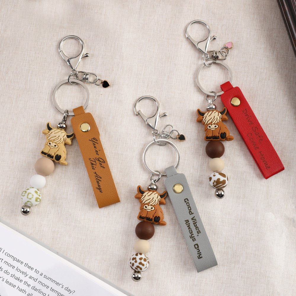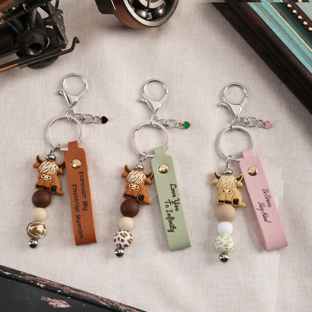 Crafted from multiple high-quality materials, ensuring both aesthetics and durability. The Highland cow, beads, and heart charms are resistant to deformation and fading; the PU leather strap has a smooth, warm texture, and the customized name and text remain clear even after prolonged friction in bags or pockets. The clasp is secure, effectively preventing keys from falling out.