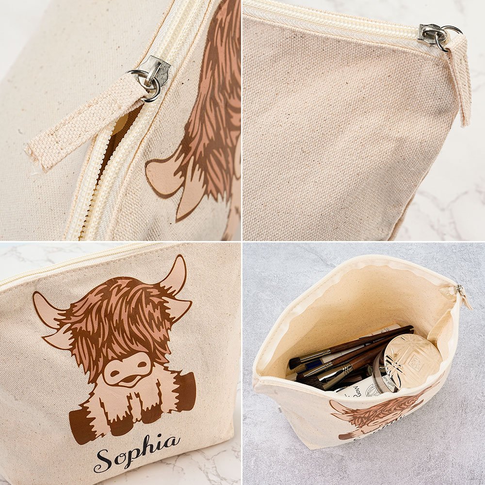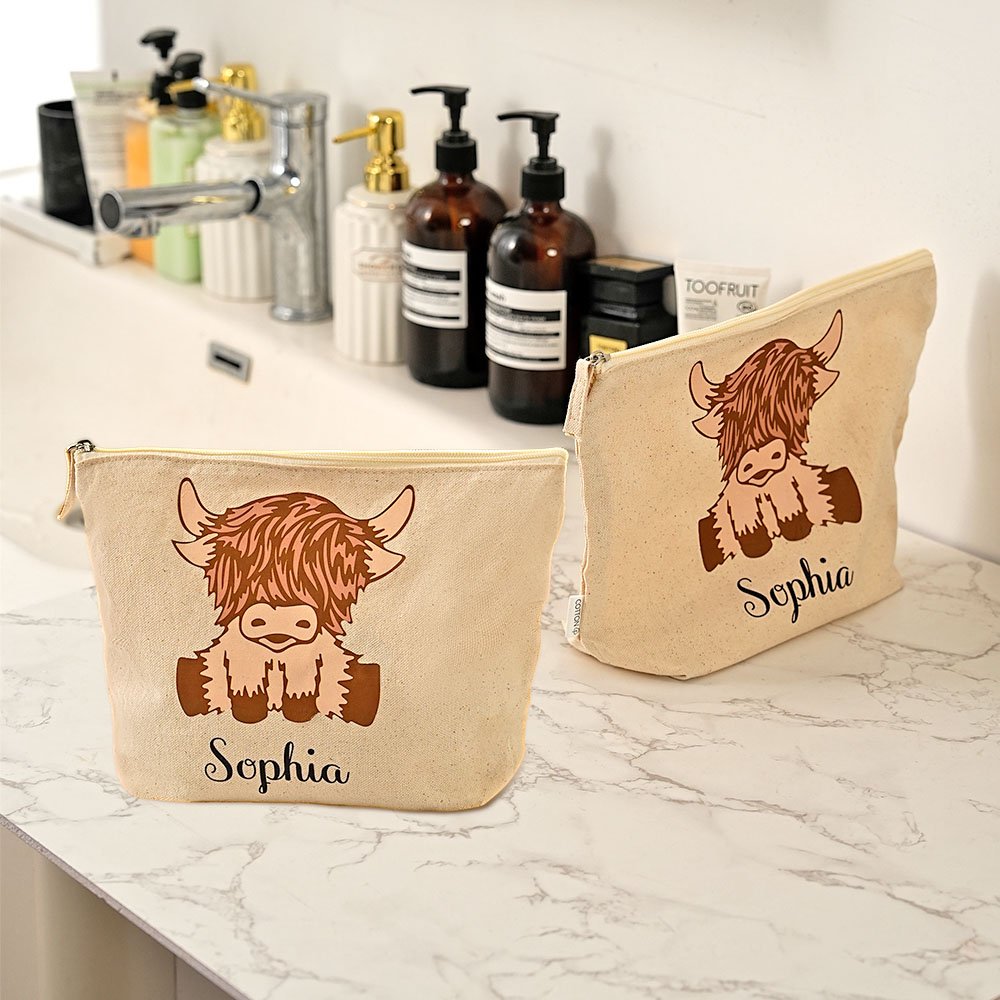 This makeup bag features a cute Highland Cow design, adding a touch of whimsy to everyday items. The personalization option allows you to add a name, making it a unique and special travel accessory. The design is not only visually appealing but also serves as a conversation starter, reflecting the owner's personality and interests.