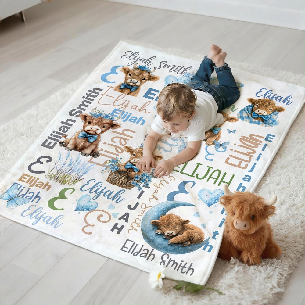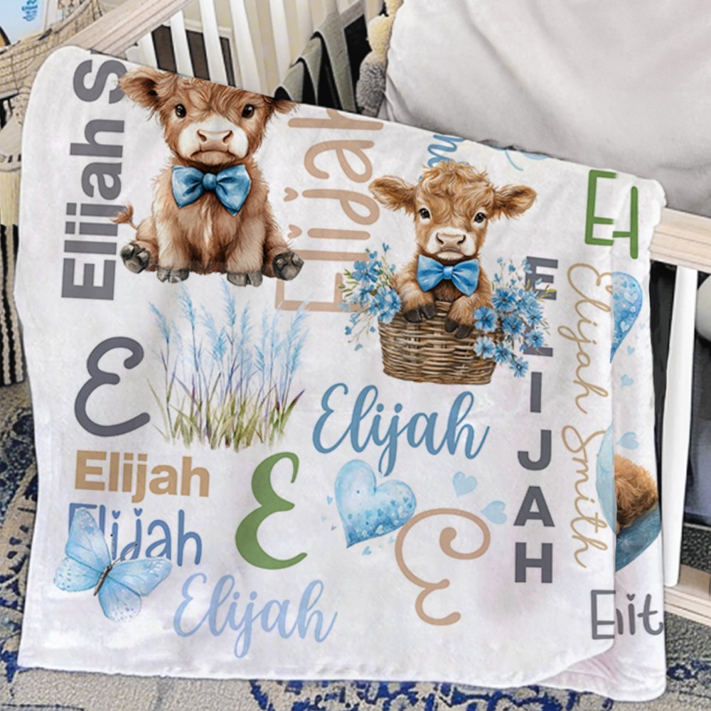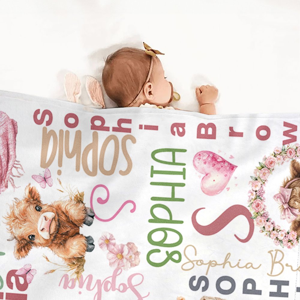 This blanket features a custom, unique design—adorable Highland cow illustrations adorned with flowers, bows, and cozy accents, paired with your chosen name and monogram, as well as charming elements like butterflies and hearts. The soft color palette and whimsical highland cow motifs turn a basic blanket into a unique, name-Personalised keepsake.