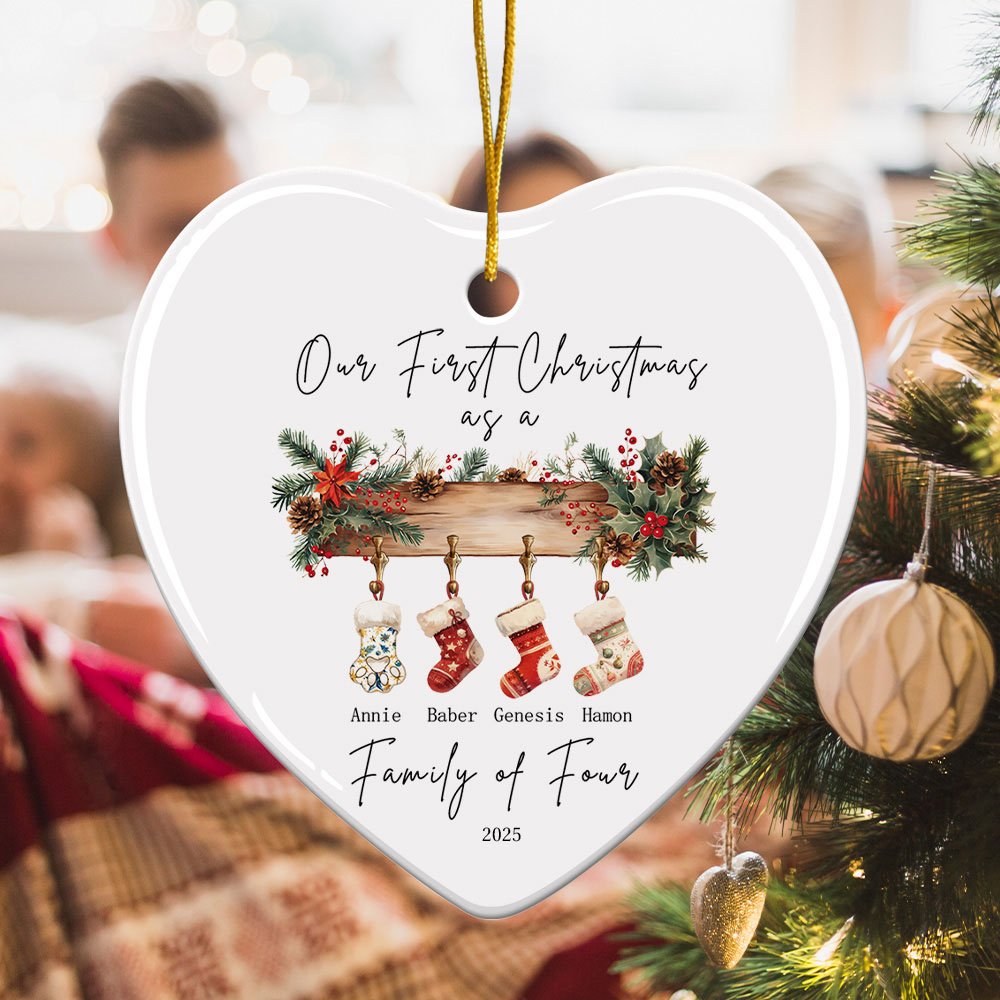 The ornament features a heart-shaped design, which immediately evokes feelings of love and warmth, making it a perfect symbol for the Christmas season. The ornament's surface is adorned with a delightful holly festival stocking design. The stockings are intricately detailed, with rich colors and patterns that capture the essence of Christmas. The holly leaves add a touch of festive greenery, enhancing the holiday spirit.