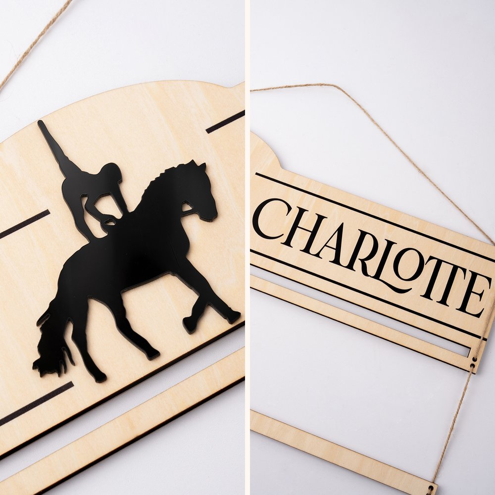 Inspired by the elegance of equestrian performances, this design highlights the passion and achievements of riders. The top bar can be customized with any text (such as your name and your horse's name), allowing each ribbon to carry a unique story and become a treasured keepsake of competition memories.