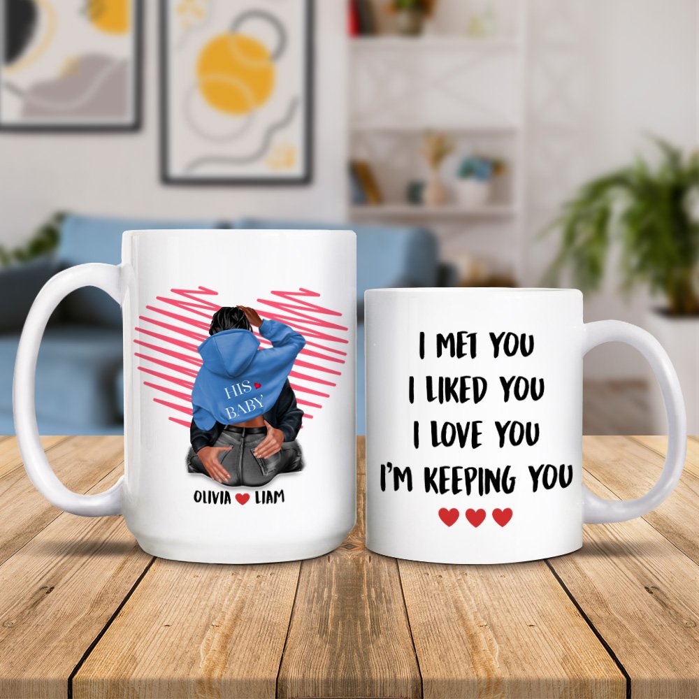 Our couple coffee mug is designed to show your love for your partner, printed with a sentimental quote" I Met You I Liked You I Love You I'm Keeping You", you are allowed to customize the names of your and your loved ones.