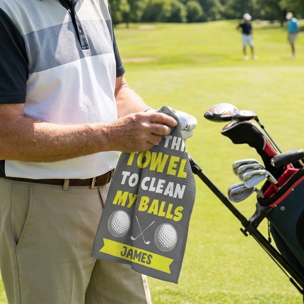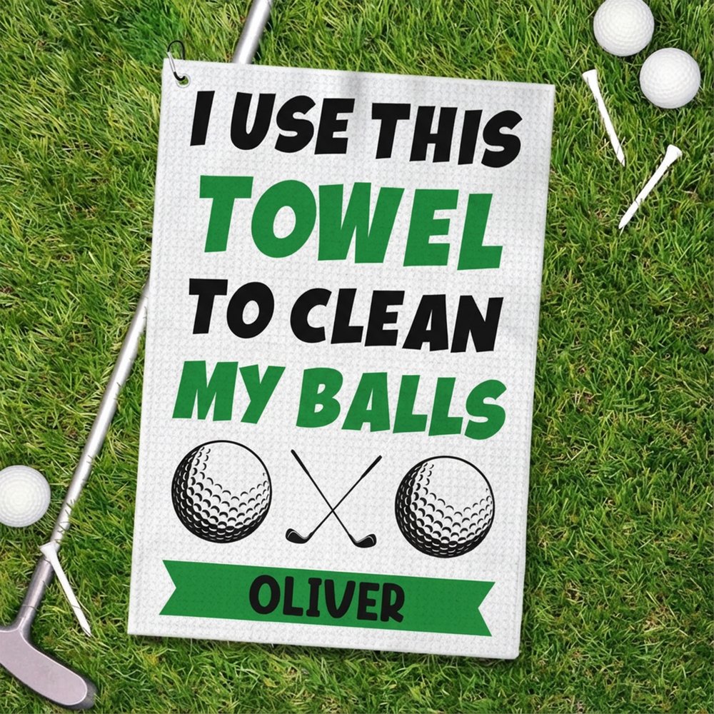 Visually, the towel has a bold, playful style. Its base color features contrasting two-color text (the cheeky “I USE THIS TOWEL TO CLEAN MY BALLS” slogan), paired with golf ball and club illustrations. Your custom name sits in a bright banner at the bottom, tying the humorous design together. Your custom name sits in a bright banner at the bottom, tying the humorous design together.