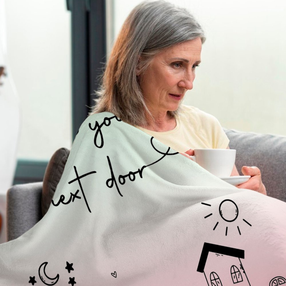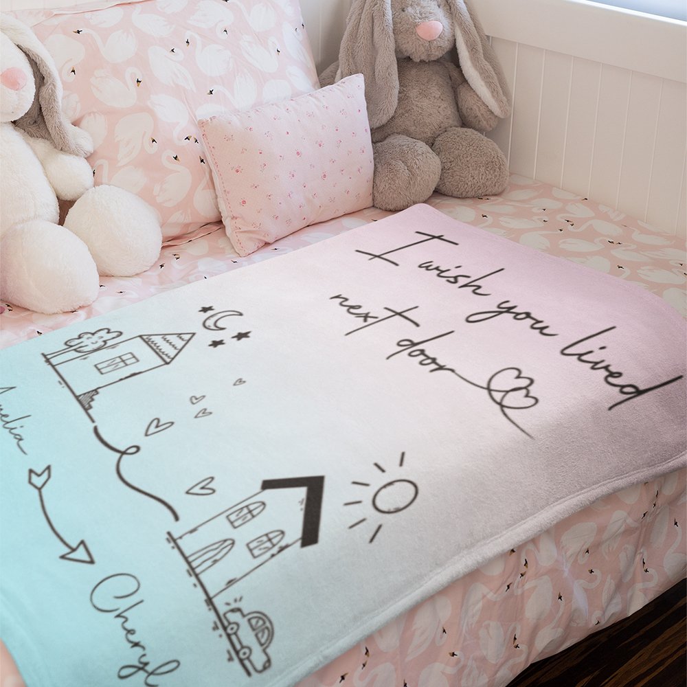 This blanket features charming illustrations of houses alongside the phrase "I Wish You Lived Next Door," conveying warmth and affection. You can Personalise it with names, creating a unique keepsake that captures special moments with friends, couples, or family.