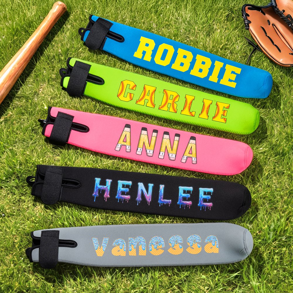 This baseball bat sleeve features a bold, sporty design with fully customizable name and font options, paired with vibrant color choices and unique graphic styles—including baseball stitch letters, pencil-shaped letters, dripping effects. Each sleeve can be tailored to reflect the player’s personality, turning a functional accessory into a standout piece that showcases individual style on and off the field.