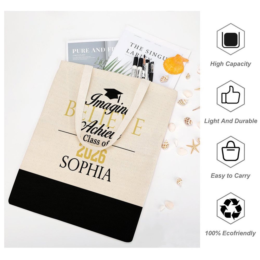 The retro-inspired design features a vibrant combination of colors and fonts, bringing a sense of nostalgia and excitement. Customize the bag with the recipient's name and graduation year, creating a truly unique and individualized gift. It's a beautiful way to celebrate their journey and accomplishments. The "Imagine Believe Achieve" slogan is a powerful reminder of the graduate's journey, dreams, and the incredible potential that lies ahead.