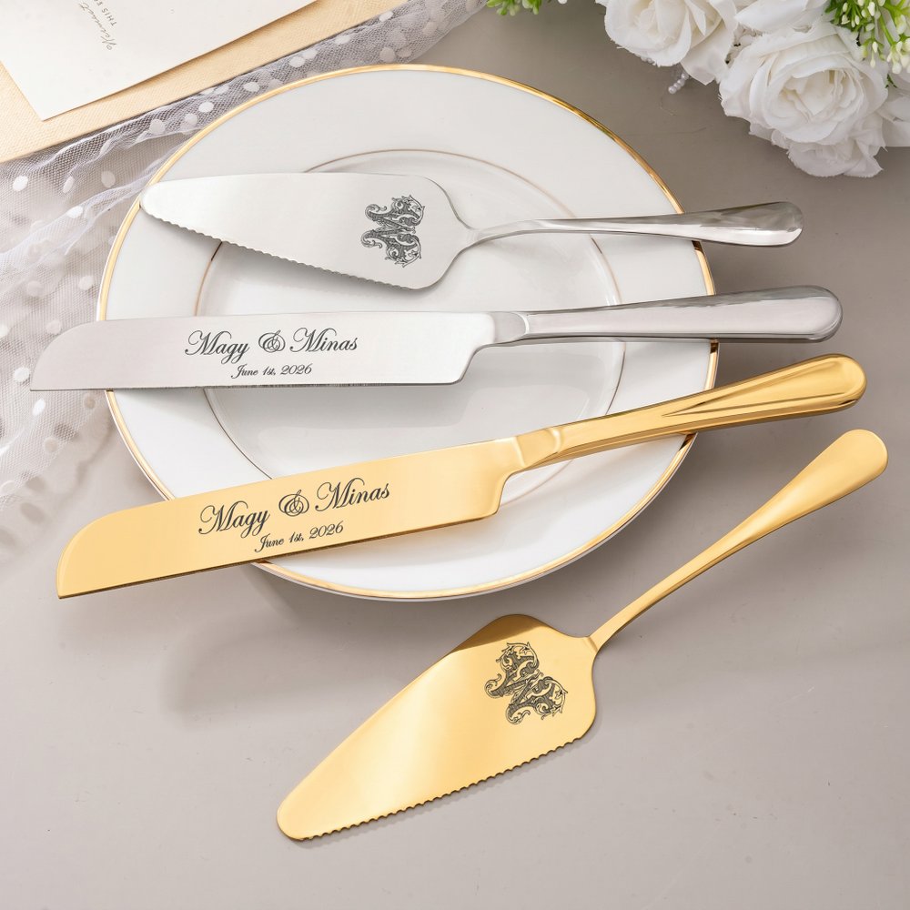 Featuring a streamlined metal design, the blade and spatula are mirror-polished for a premium, lustrous finish. The classic teardrop handle offers a comfortable grip. Customization is available with names of the couple, wedding date, and vintage-inspired single letters, showcasing exquisite details and enhancing the overall ceremonial feel.