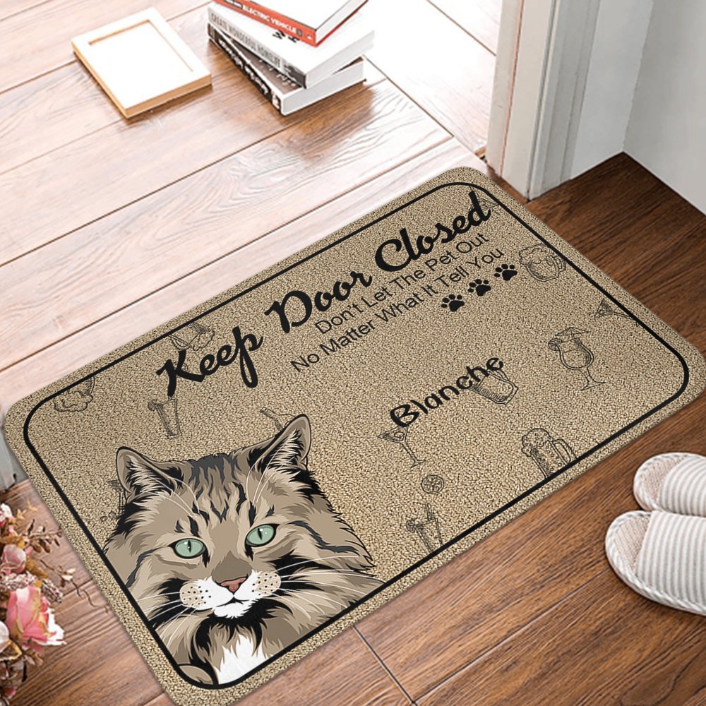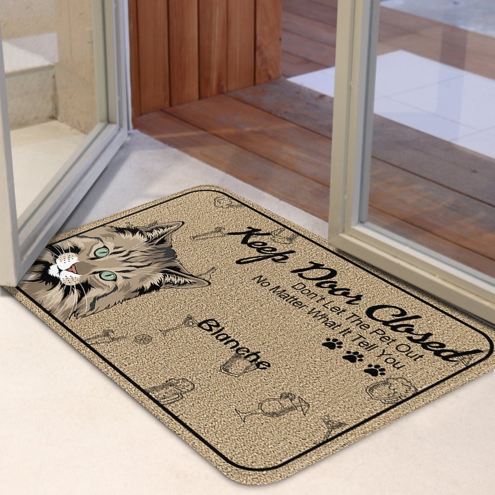 With the playful text "Keep Door Closed, don't let the pets go, no matter what it tells you", this mat serves as a friendly reminder to keep furry friends safe indoors. It's a fun and playful way to express your love for your pet and set a lighthearted tone in your household.