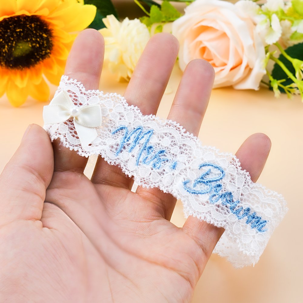 This exquisite bridal garter offers a choice of six delicate accessories, including a lace bow, a lace flower, a lace heart, and a mini blue and a mini white bow. Each piece is beautifully embroidered with custom text in an elegant blue—a hue that symbolizes loyalty and eternal love. Blending traditional blessings with a contemporary design, it adds a touch of timeless sophistication to any wedding celebration.