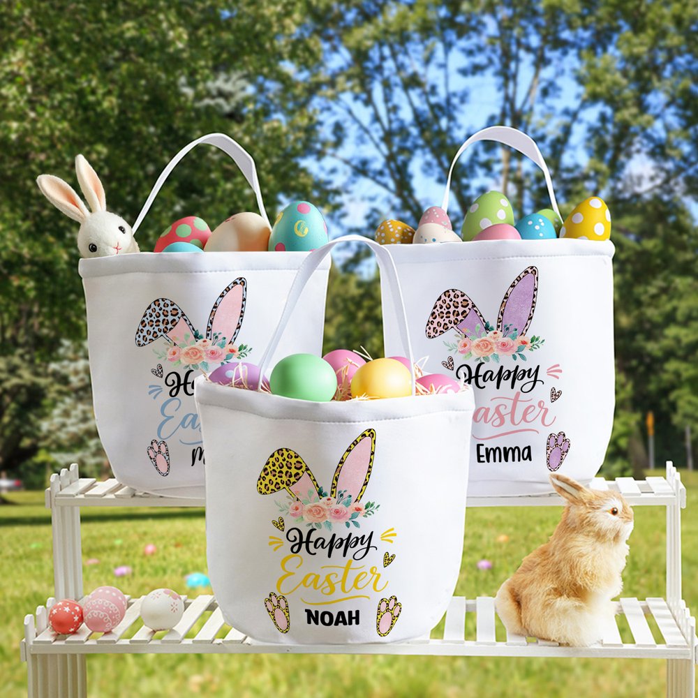 Personalised Leopard Print Flower Bunny Reusable Canvas Basket with Name Happy Easter Gift for Boys Girls