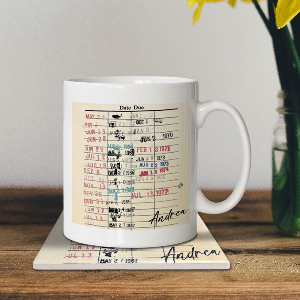 The mug and coaster feature a vintage design and contain a pattern of the library date-due card. It will add a little vintage charm to your morning routine and instantly create a vintage feel for your home, office, or shop.