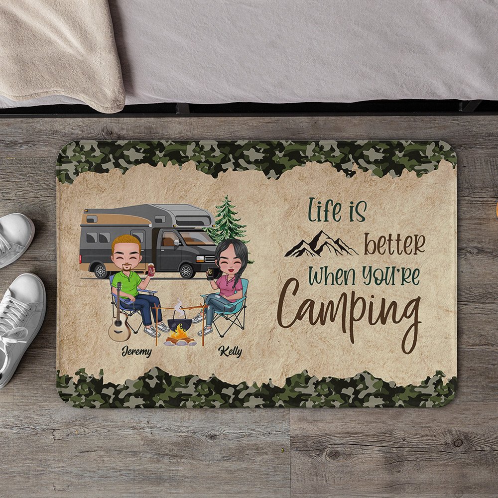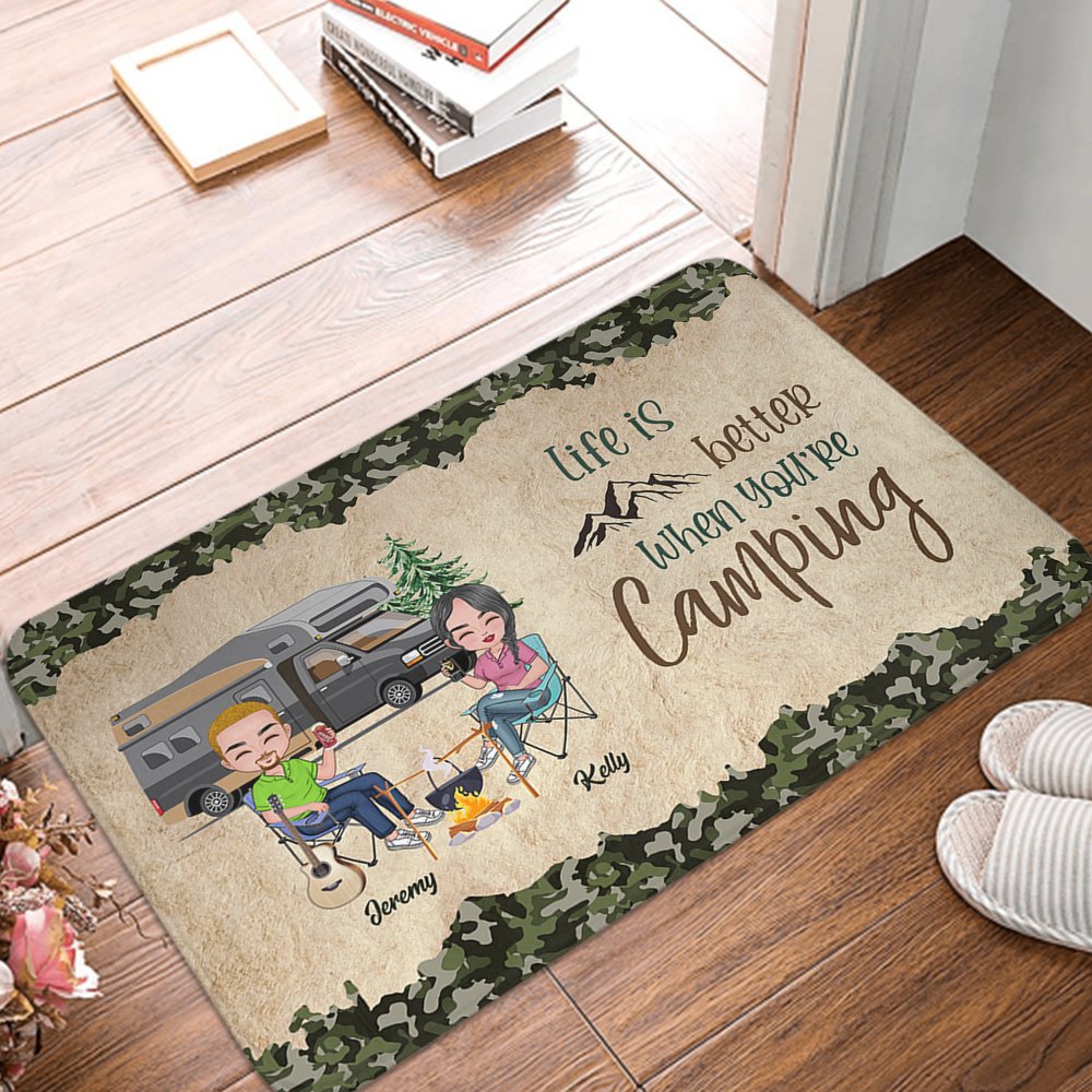 The message "Life is Better When You're Camping" is beautifully printed on the doormat, reminding the couple of their everlasting love and the adventures they have shared.