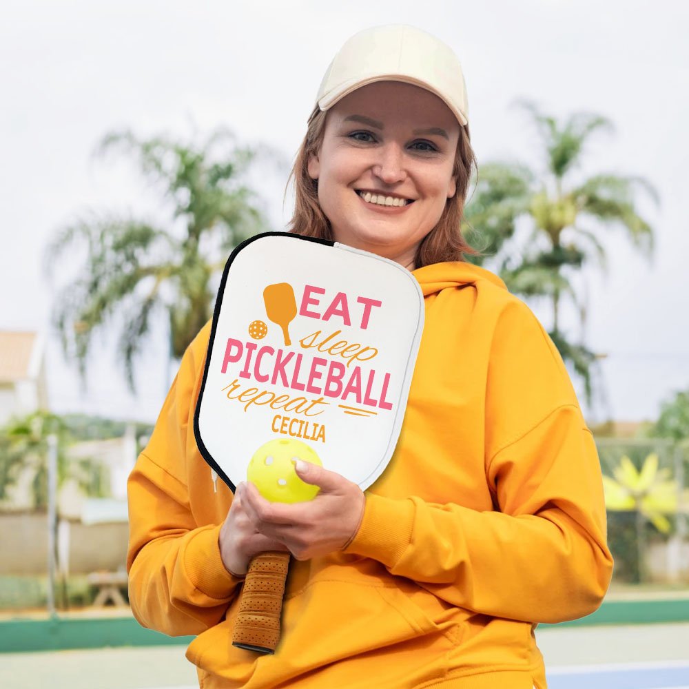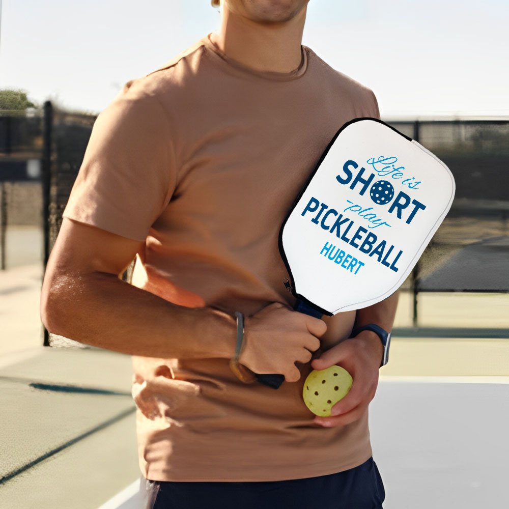 The pickleball paddle cover is white as the base colour, clean and pure. The text "Life is Short Play Pickleball", "Life is Short Play Pickleball", "Pickleball Star Dill with It" is matched with 11 different colours. The pattern elements of pickleball are also cleverly integrated in the middle, adding fun and theme. The customizable name design below makes the paddle cover more exclusive.